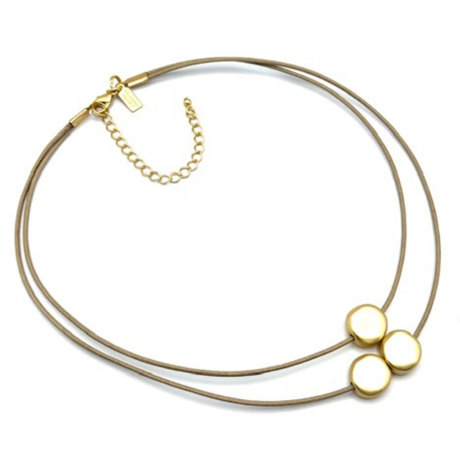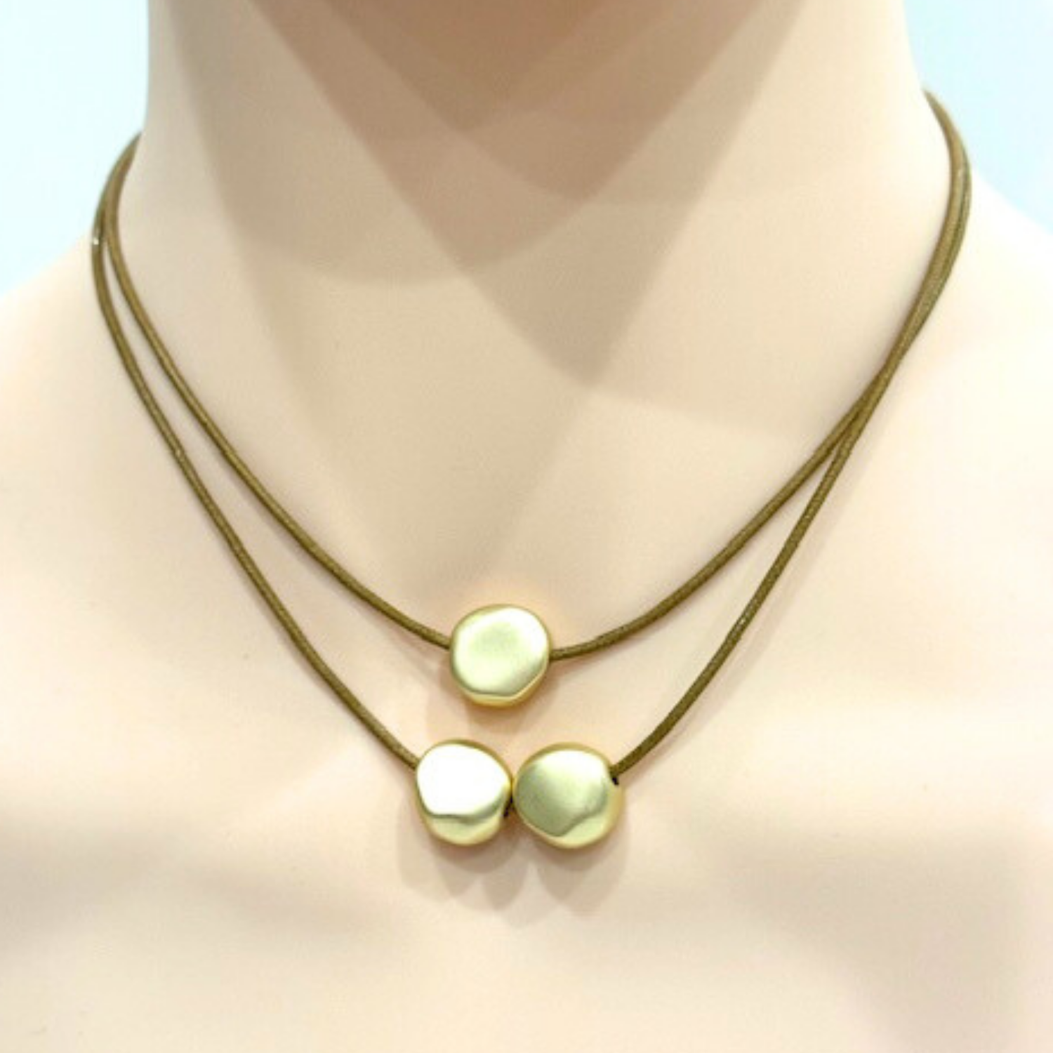 Gold Bead Necklace On Natural Waxed Linen Cord - This necklace features three matte gold flat beads arranged in a graduated design. The natural waxed linen cord adds a bold, modern touch while ensuring durability and comfort.