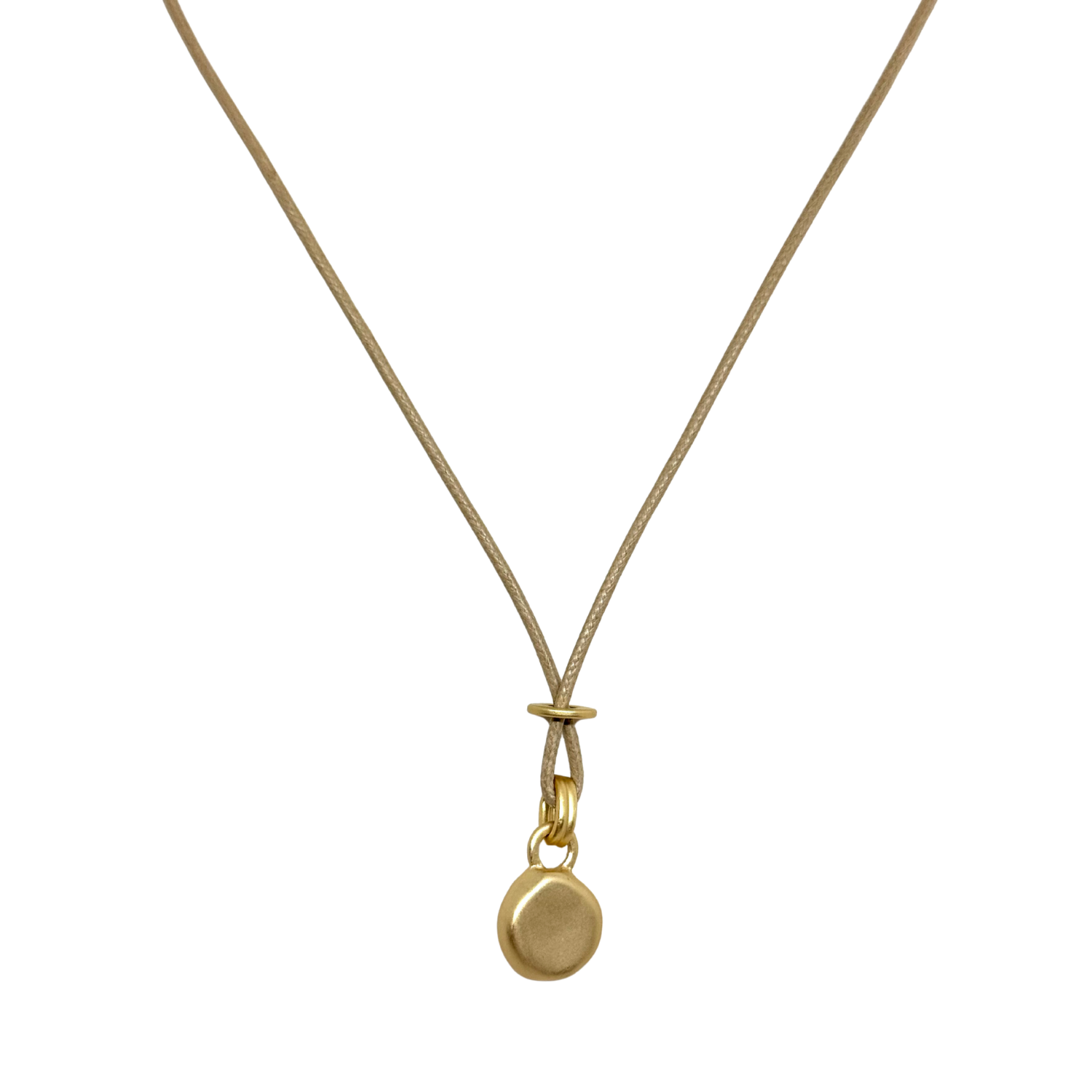 A matte gold nugget charm necklace featuring a striking crisscross design on a 16-inch natural color waxed linen cord