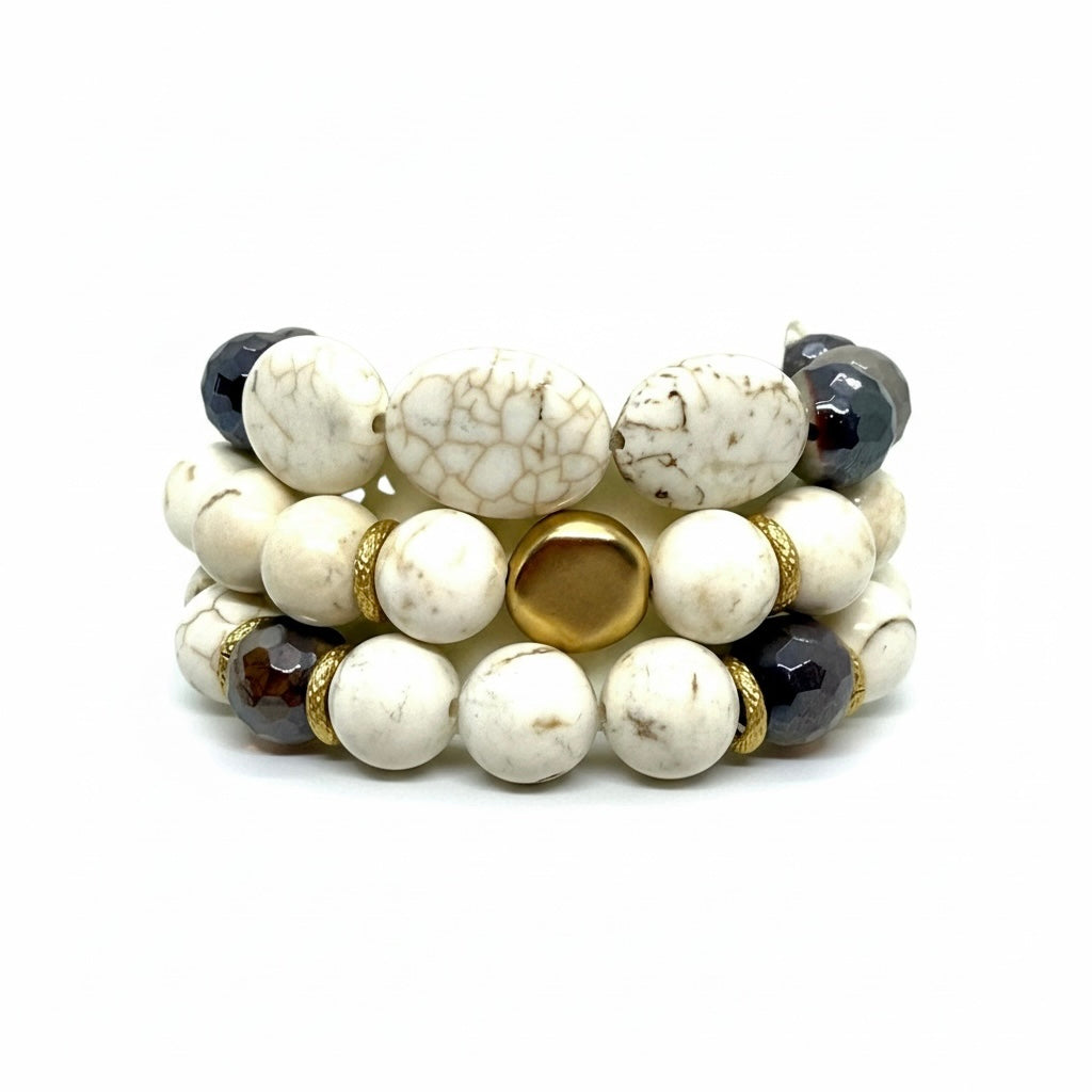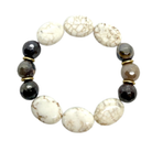 Stretch bracelet featuring white magnesite oval stones paired mookaite beads and matte gold accents.
