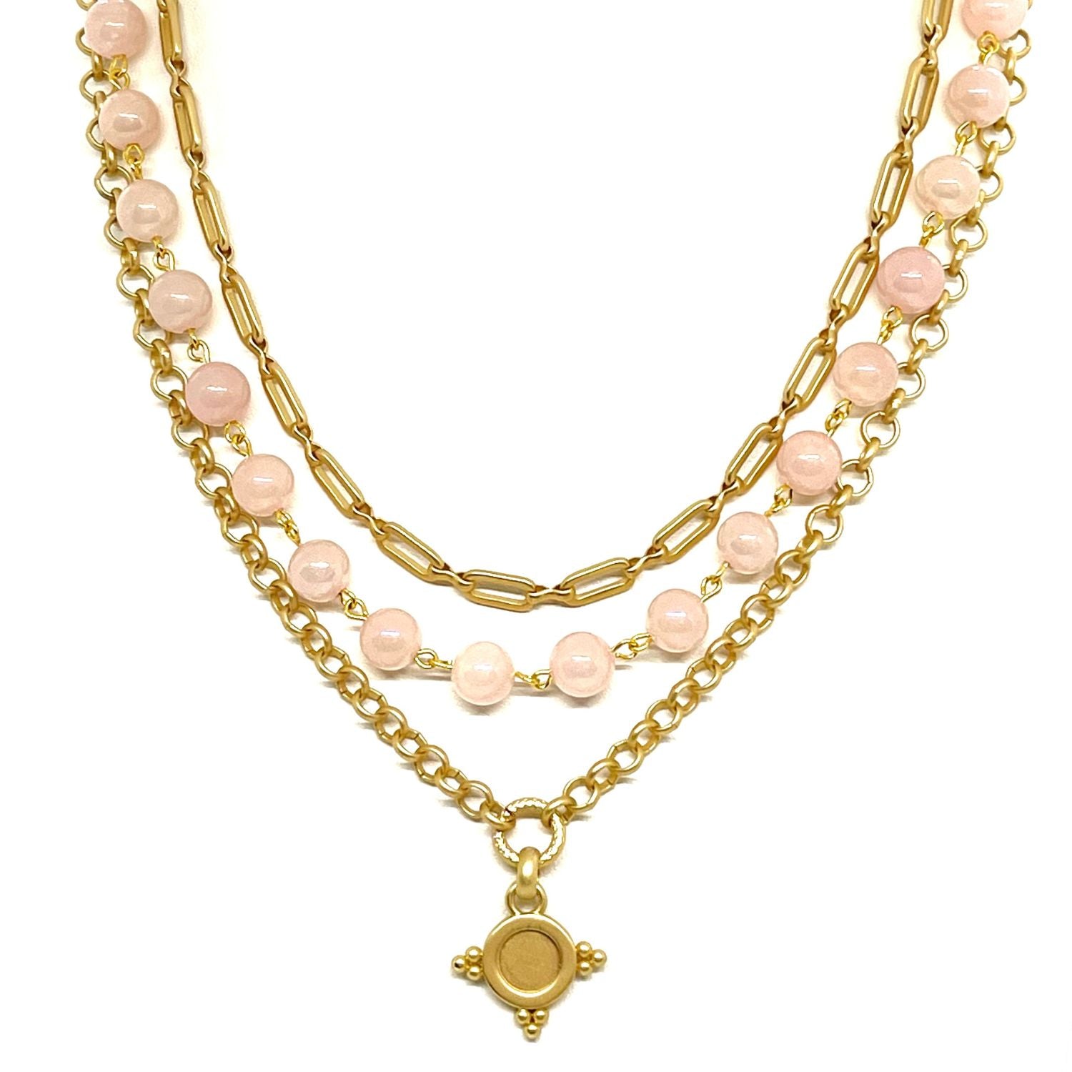Rose Quartz 3 Strand Matte Gold Multi Chain Necklace