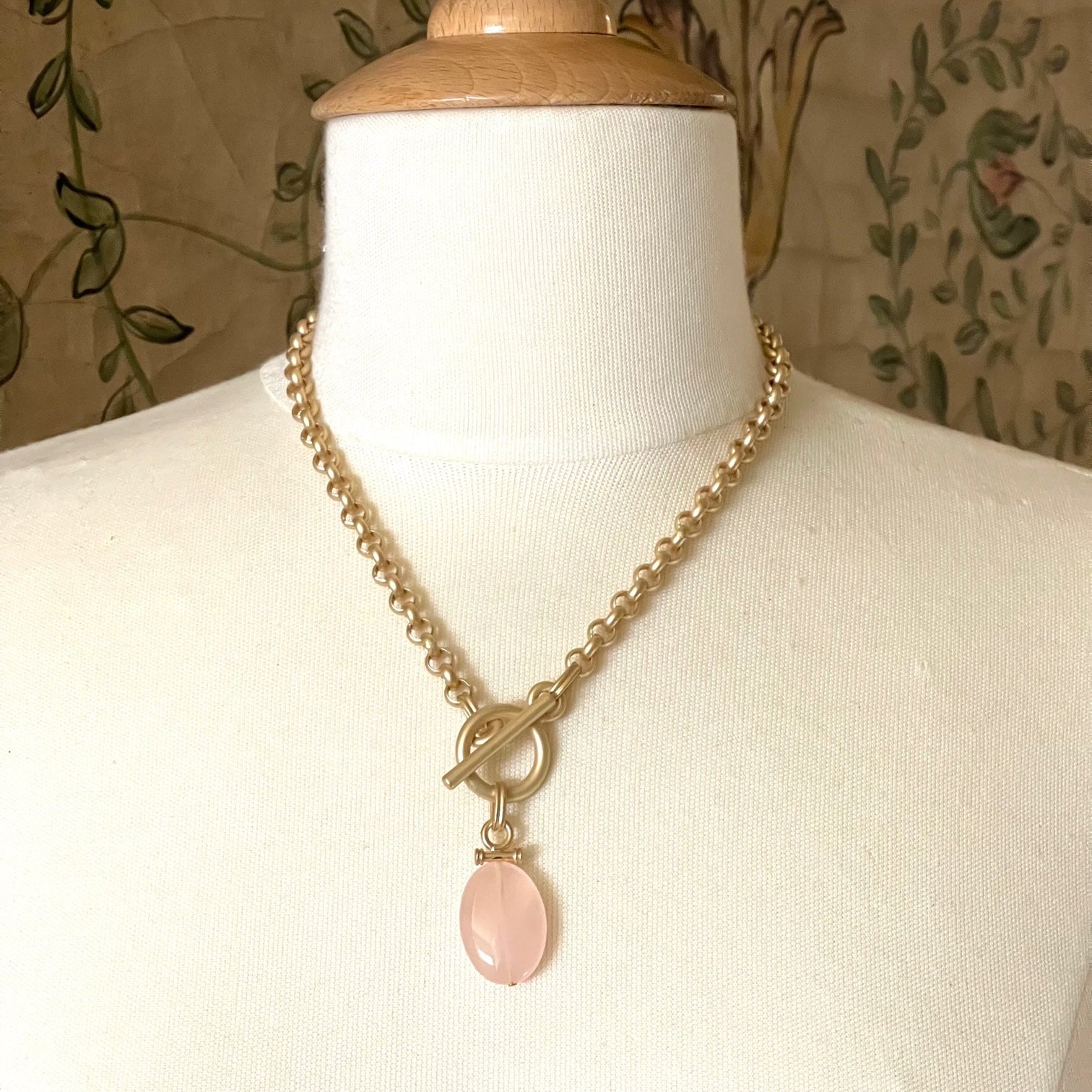 Rose Quartz Bar Pendant on Matte Gold Chain Necklace