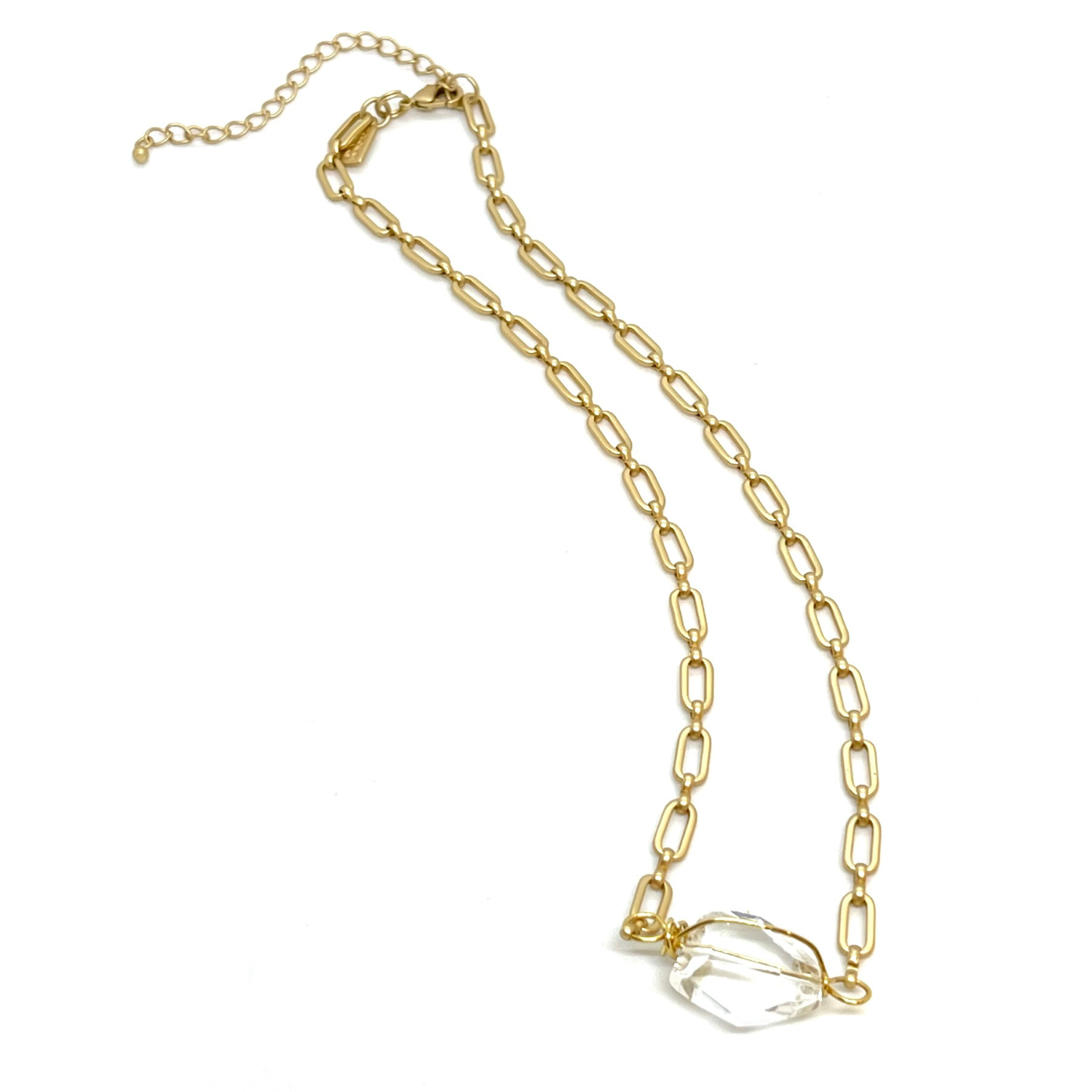 Wire Wrapped Clear Nugget Crystal on Matte Gold Paperclip Chain