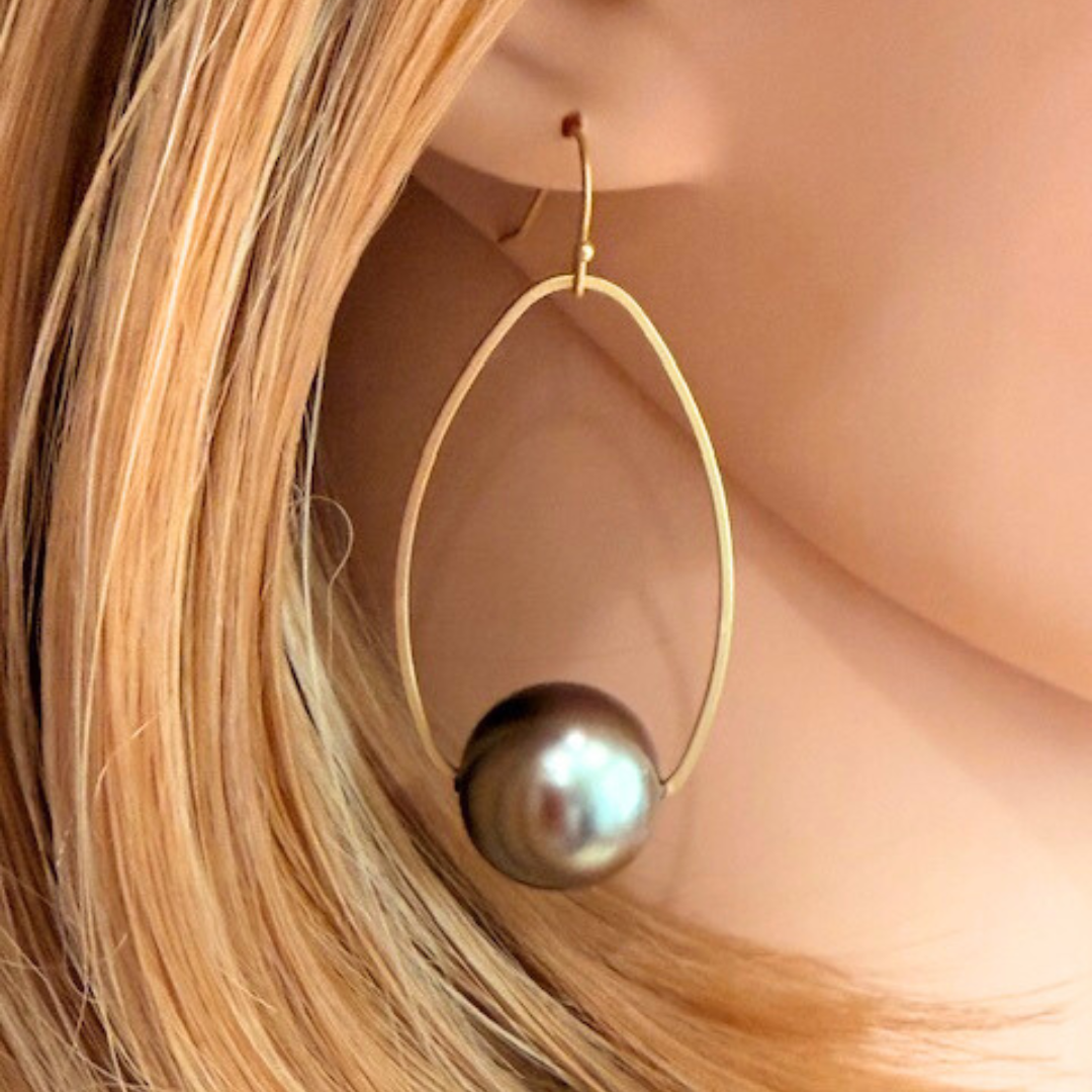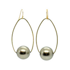 These earrings showcase 16mm taupe glass bubble pearls set within matte gold oval wire frames.