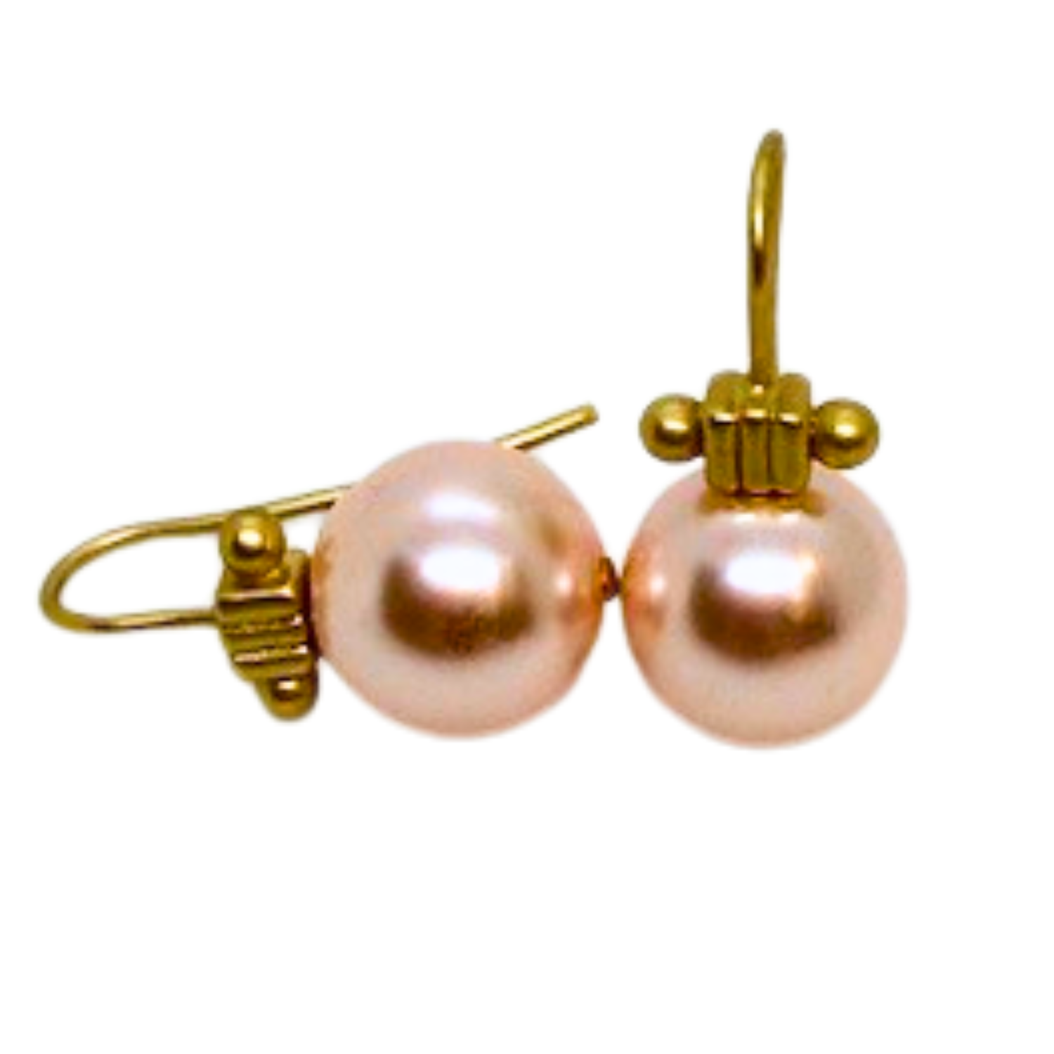 12mm pink glass pearls suspended from sleek matte gold column-top hooks.
