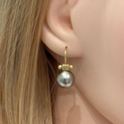 12mm taupe glass pearls suspended from sleek matte gold column-top hooks.