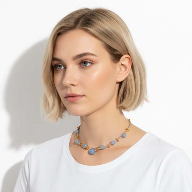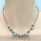 This necklace features natural matte aquamarine paired with a matte gold disks, woven together with natural linen and leather.