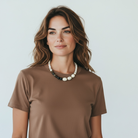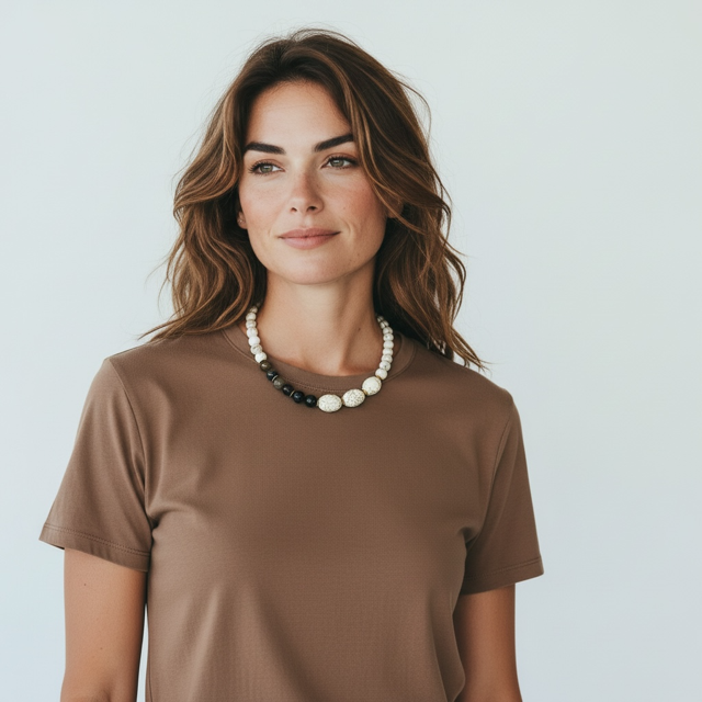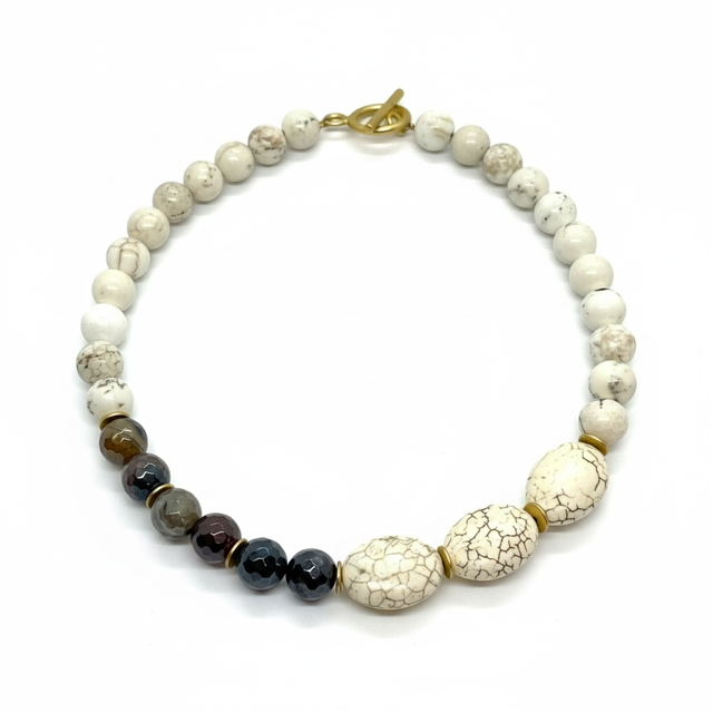This striking necklace features mookaite beads and three substantial white magnesite stones as focal points, creating a bold statement piece.