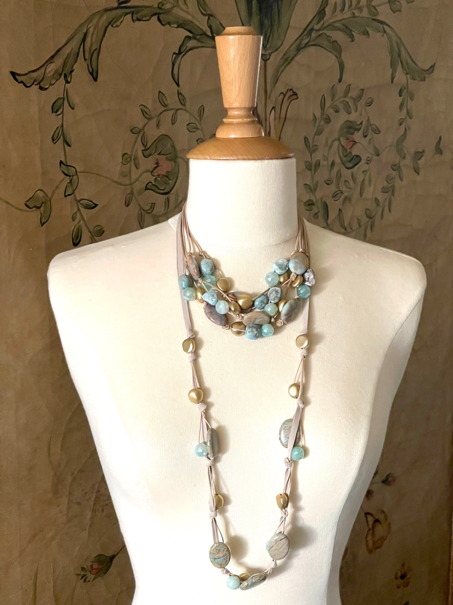 This torsade necklace weaves together three gemstones in shades of blue and aqua. Blue Aqua Terra Jasper, natural Larimar, and glazed Aqua Agate are strung on a natural tone linen and leather.