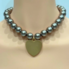 This necklace features 16mm taupe glass pearls, paired with a large matte gold heart pendant and a toggle closure.