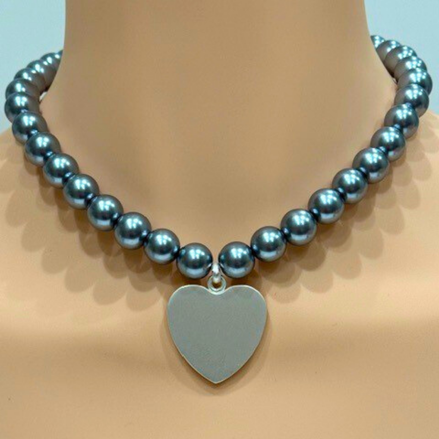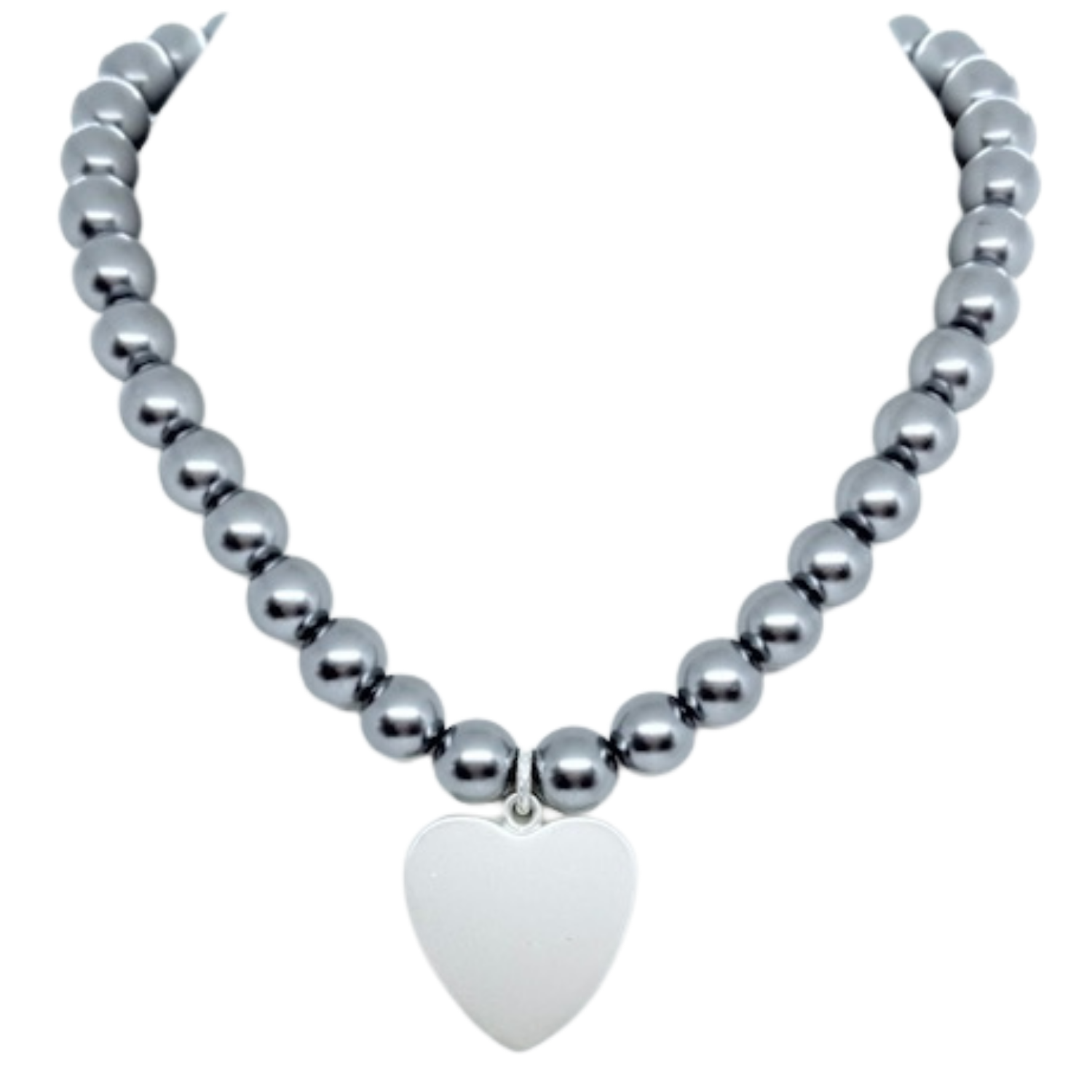 This necklace features a 12mm gray glass pearl complemented by a medium matte silver heart pendant and matte silver toggle closure.