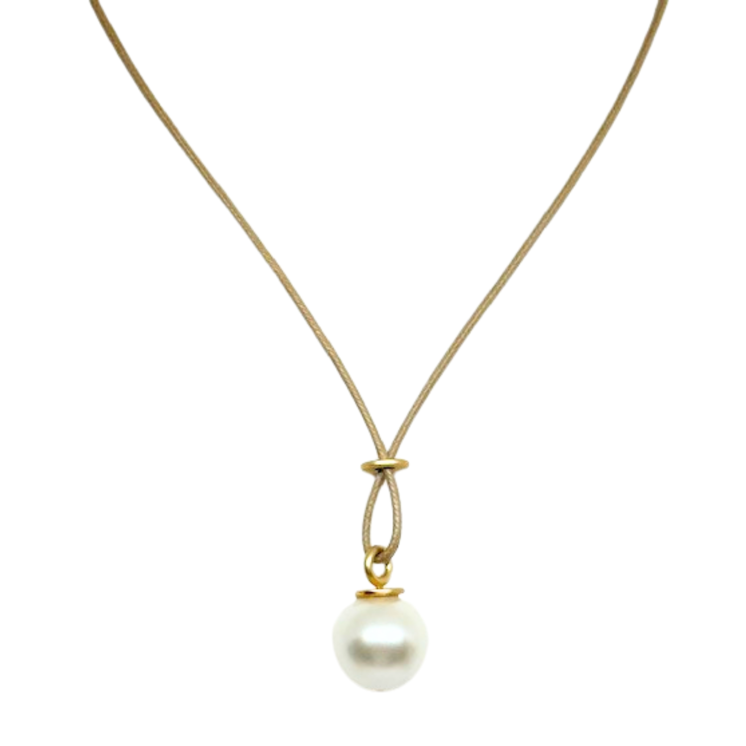 This necklace featuring a bold 16mm white glass pearl topped with a matte gold disk on a 16" waxed natural color linen cord.
