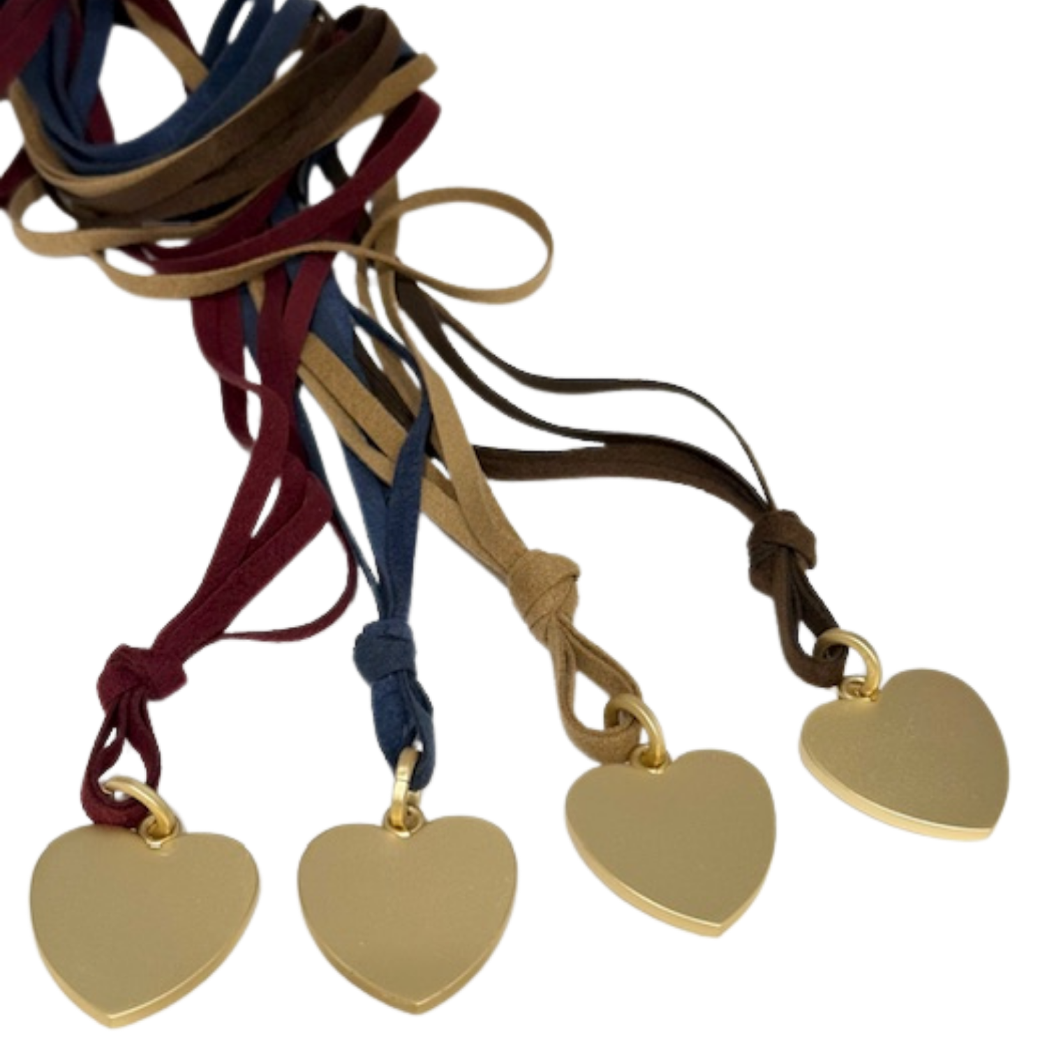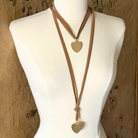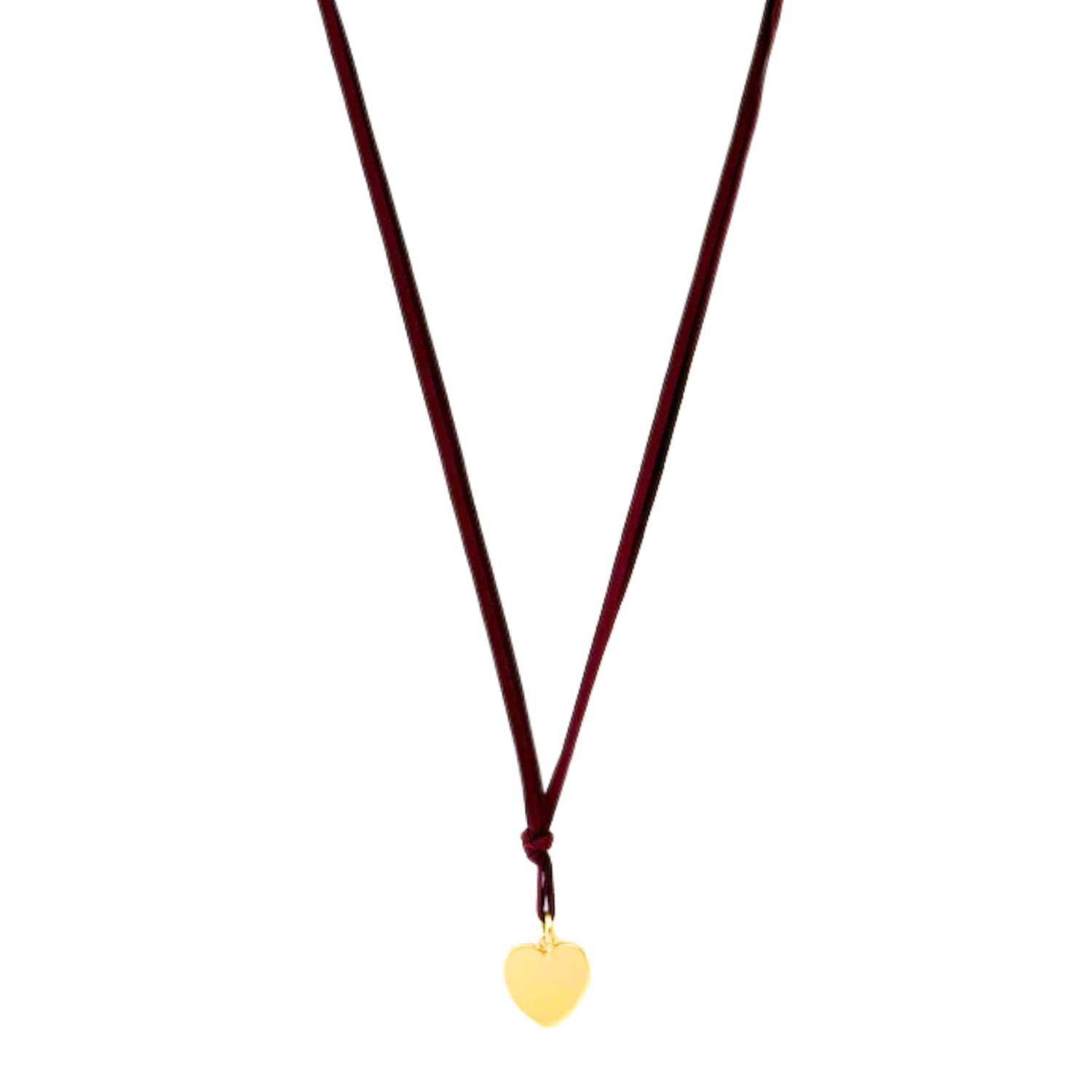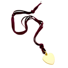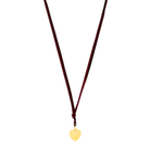 This necklace features a matte gold 1.25-inch medium heart pendant suspended on two strands of 36-inch burgundy suede.