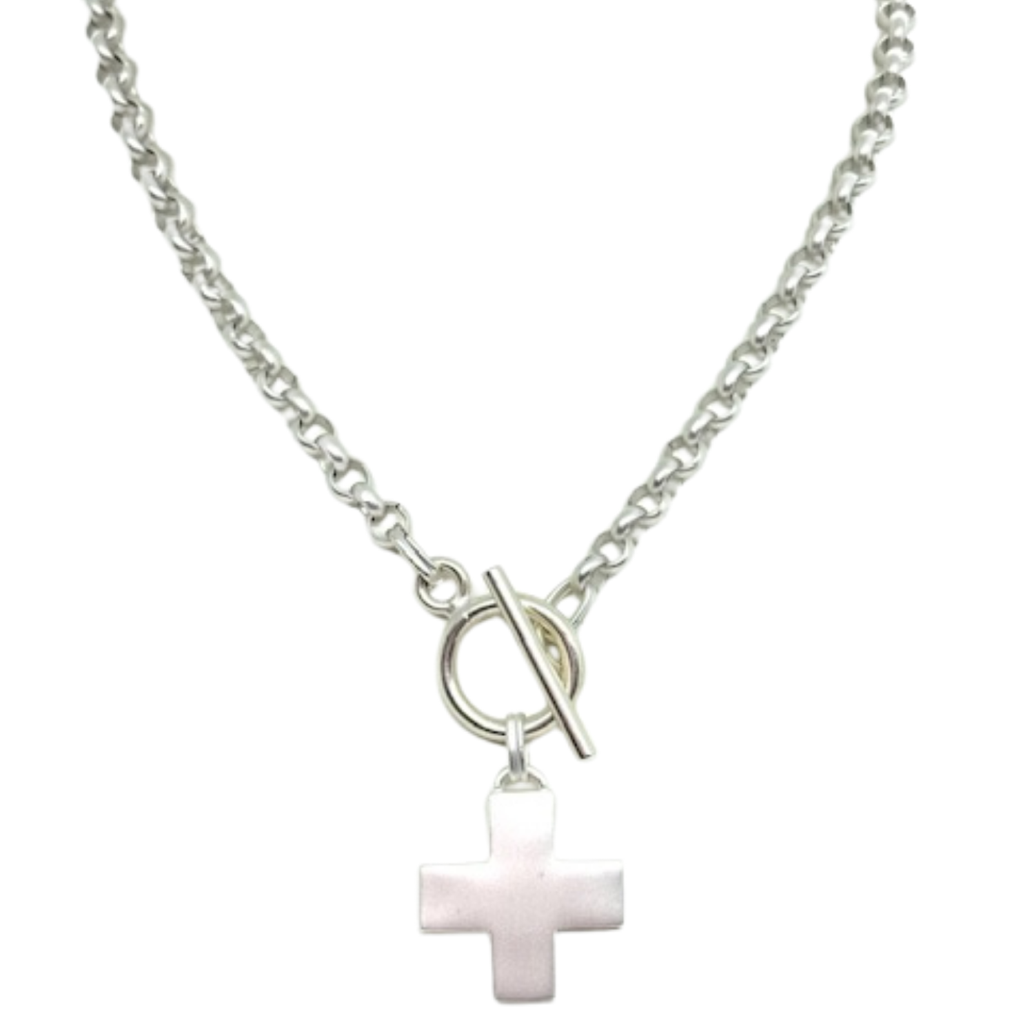 This elegant matte silver cross pendant hangs gracefully from a matching matte silver rolo chain.