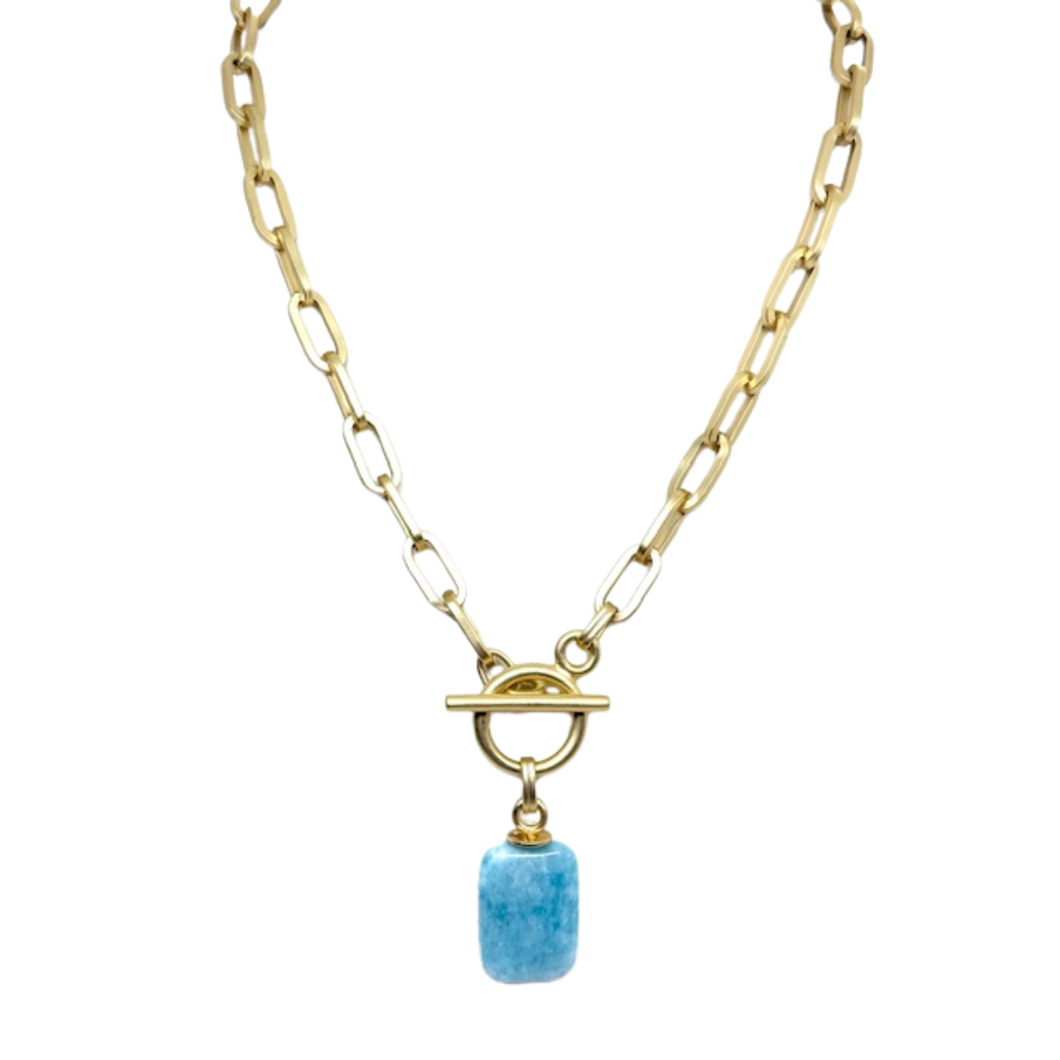 This necklace features a striking, rectangle-shaped, larimar stone on a matte gold paperclip chain.