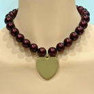 This necklace features 16mm burgundy glass pearls, paired with a large matte gold heart pendant and a toggle closure.