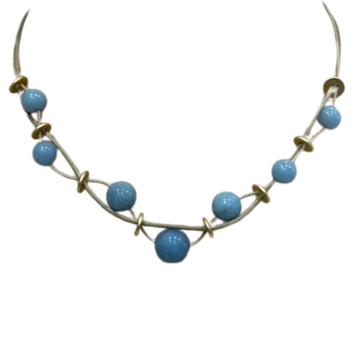 This necklace features natural blue angelite paired with a matte gold disks, woven together with natural linen and leather.