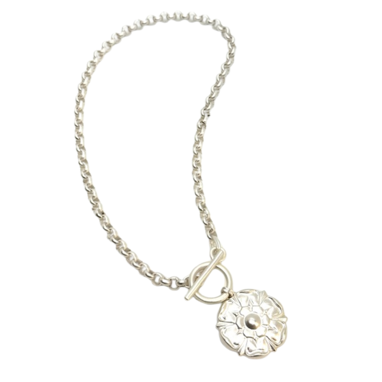 This necklace features a matte silver flower pendant suspended from a rolo chain, secured with a toggle closure for easy wear.