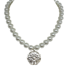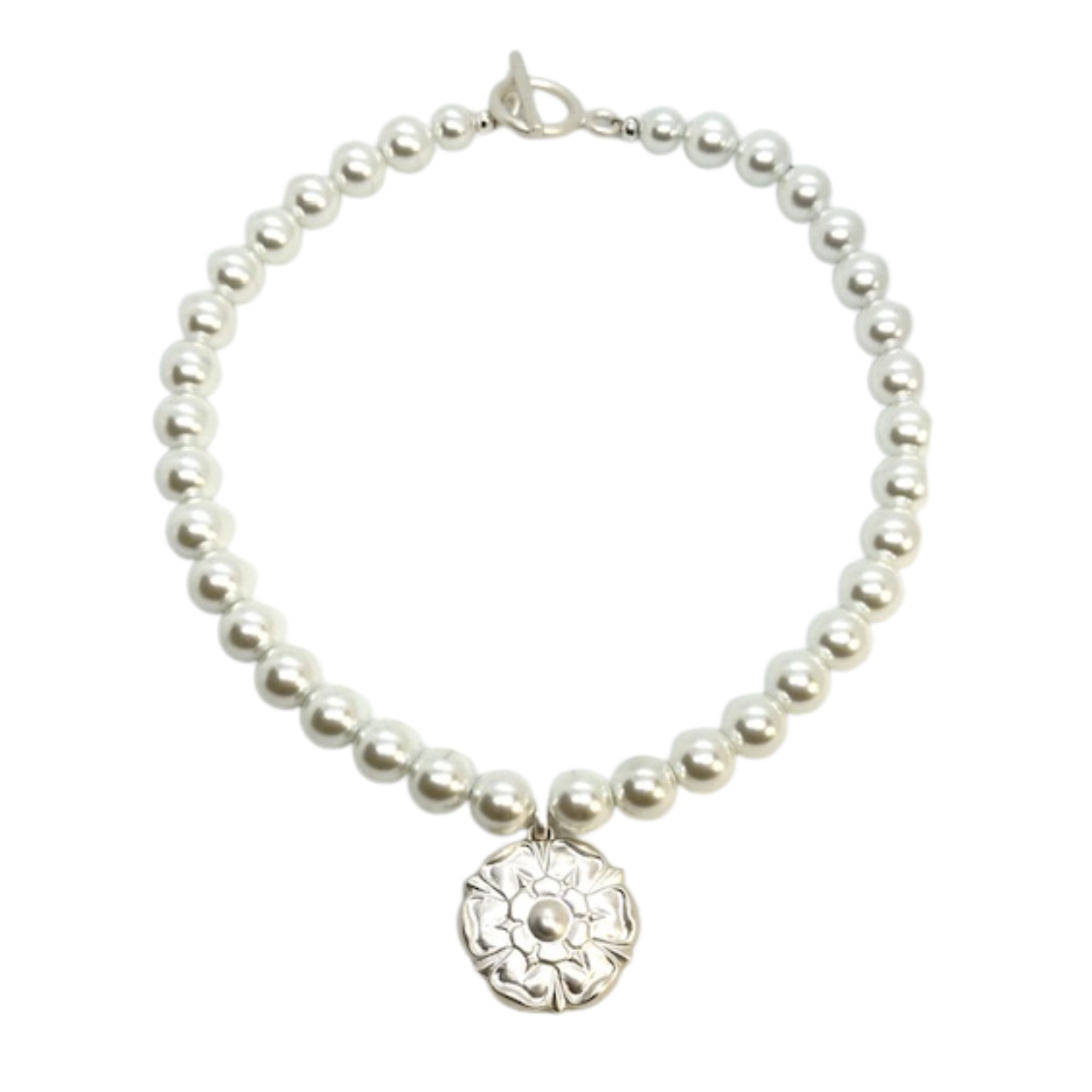 Elegant white glass pearls in a generous 12mm size showcase a stunning matte silver flower pendant, secured with a convenient toggle closure.