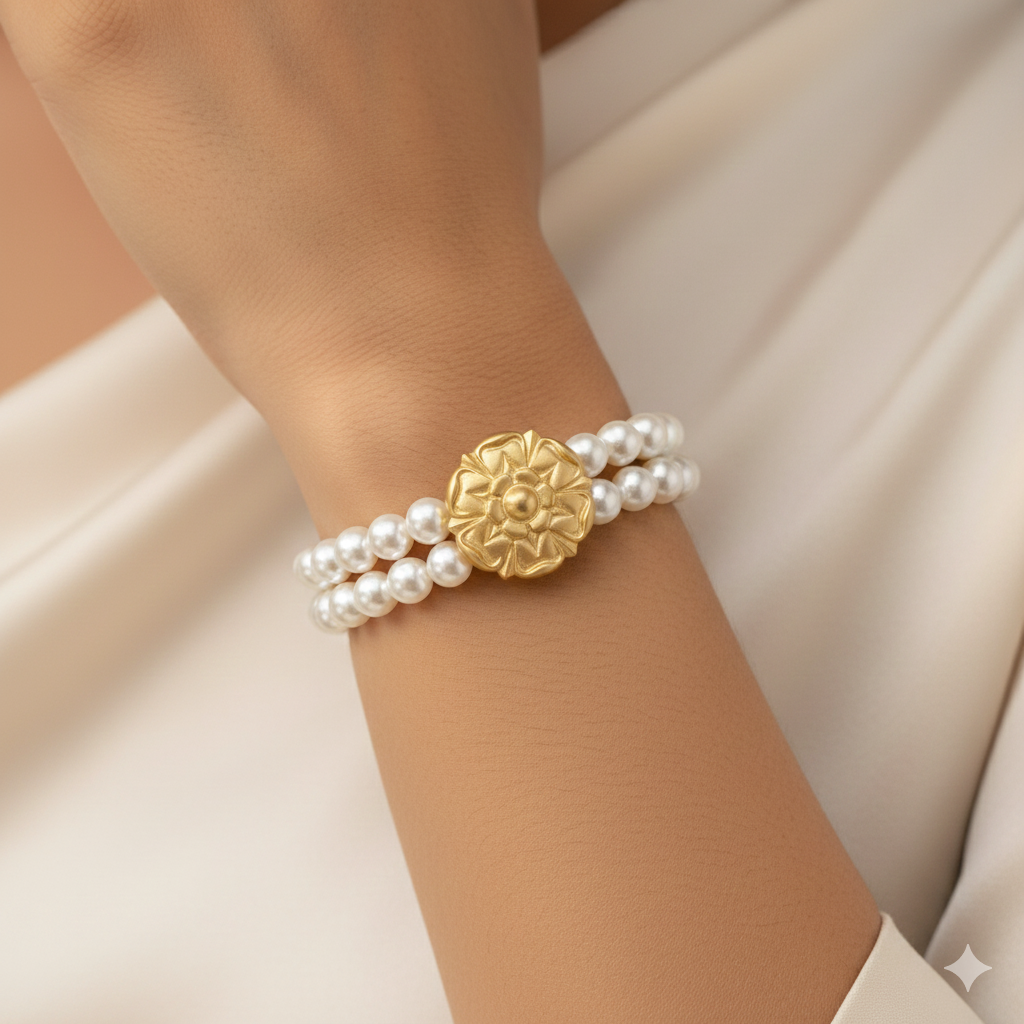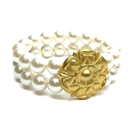 White pearl stretch bracelet featuring two strands of lustrous 12mm pearls accented with an intricate matte gold flower.