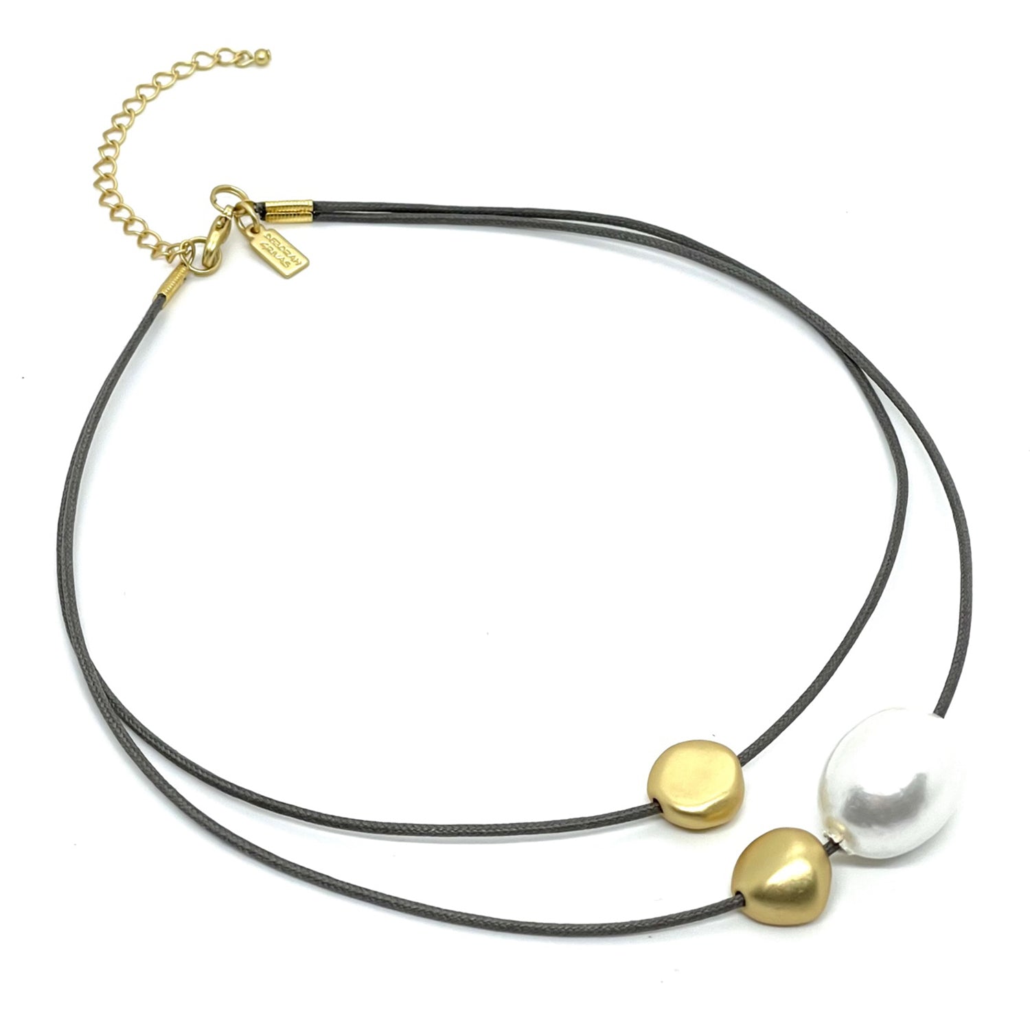 Cotton Pearl And Matte Gold Bead Waxed Black Linen Graduated Necklace