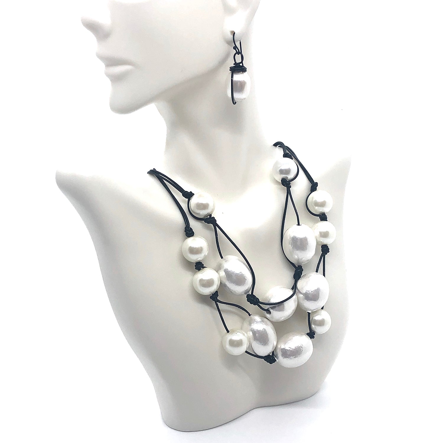 Cotton And Glass Pearl 2 Strand Black Leather And Linen Necklace Glass Pearl Gold Wire Earring