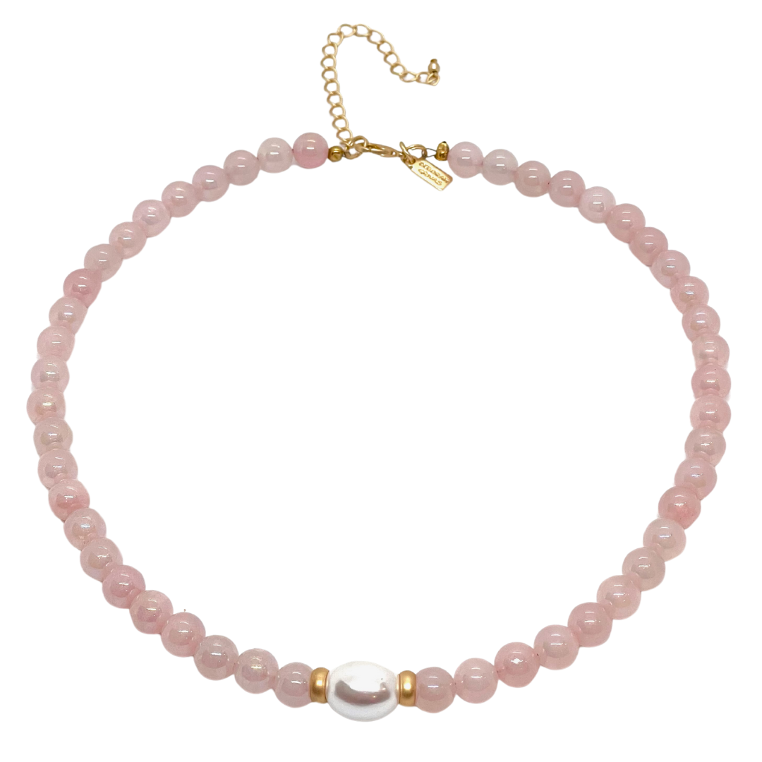 Rose Quartz With MOP Pearl Center and Matte Gold Accents Necklace