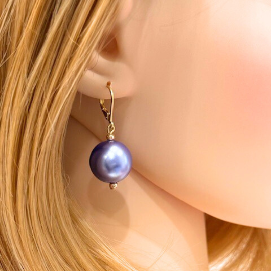 Lavender Bubble Pearl Earrings, featuring luminous 16mm glass pearls on a matte gold lever-back design.