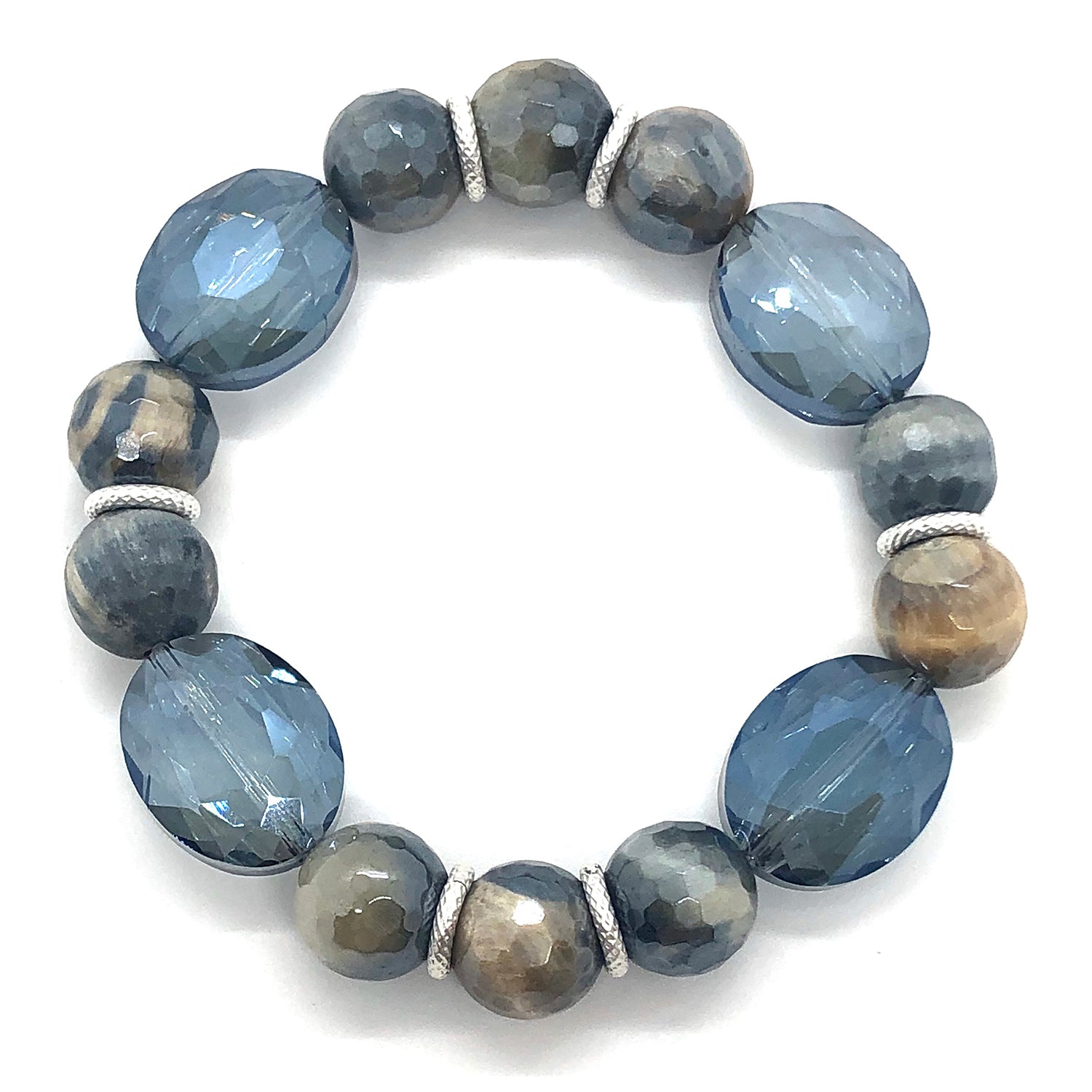 Labradorite Blue And Cream Glazed Agate,Labradorite Oval Crystal And With Matte Silver Roundels Stretch Bracelet