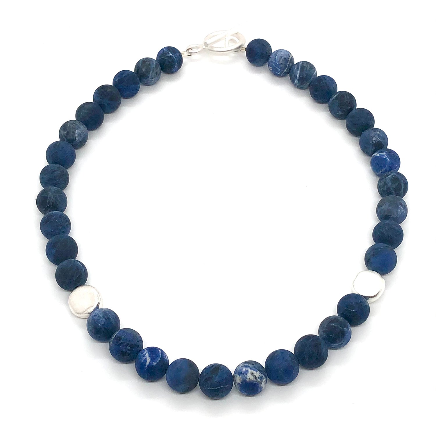 Matte Blue Sodalite With Matte Silver Flat Bead Necklace