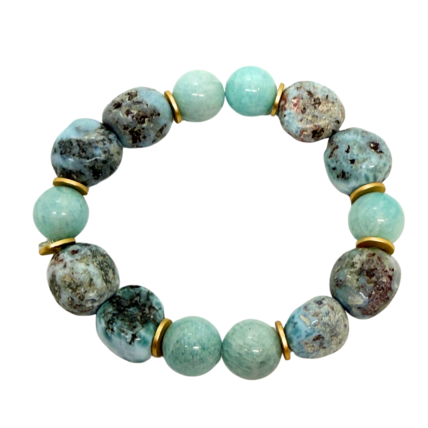 Natural amazonite beads and larimar nuggets stretch bracelet with matte gold disk accents that add understated richness.