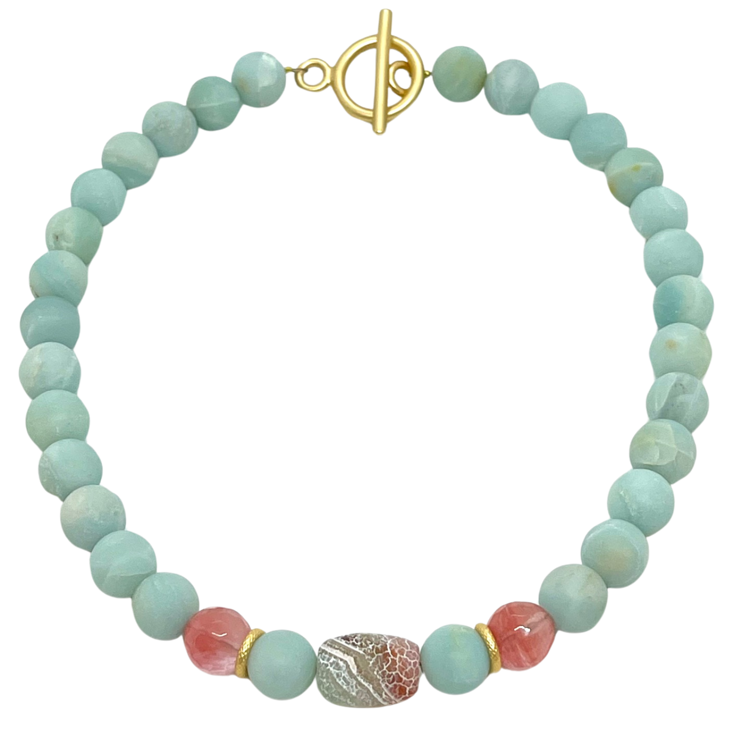 Watermelon Quartz and Amazonite with Fire Agate Center Beaded Necklace