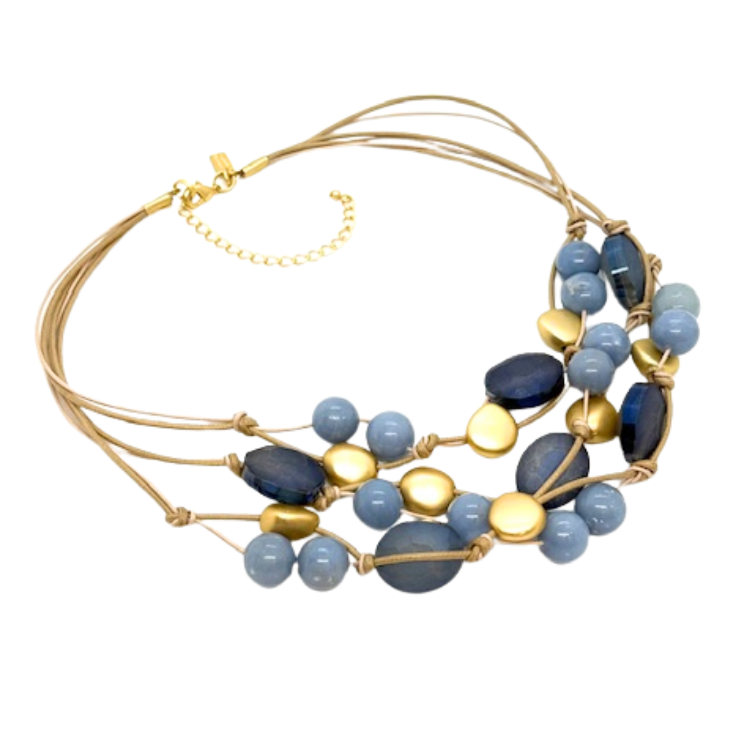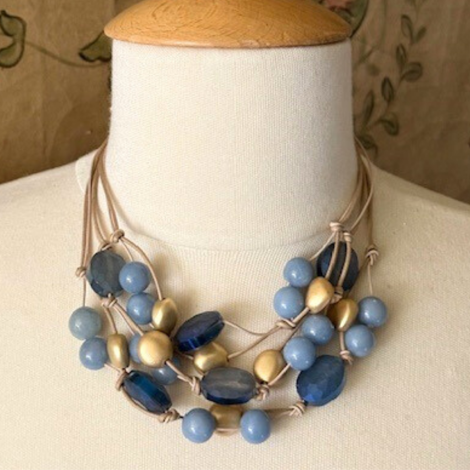 This torsade necklace features a blend of matte blue crystal and blue angelite, accented with matte gold beads and complemented by putty leather and natural linen.