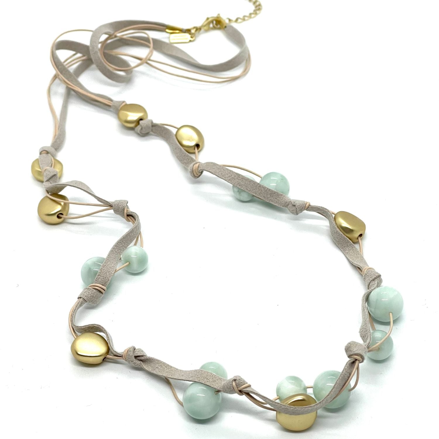 Angelite and Matte Gold Leather and Suede layer Necklace