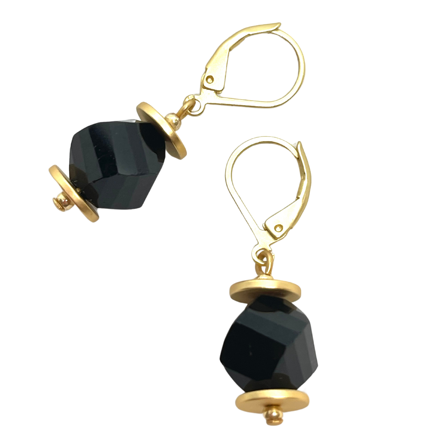 Black Slice Crystal Earrings with Matte Gold Saucer Accents on Lever Backs