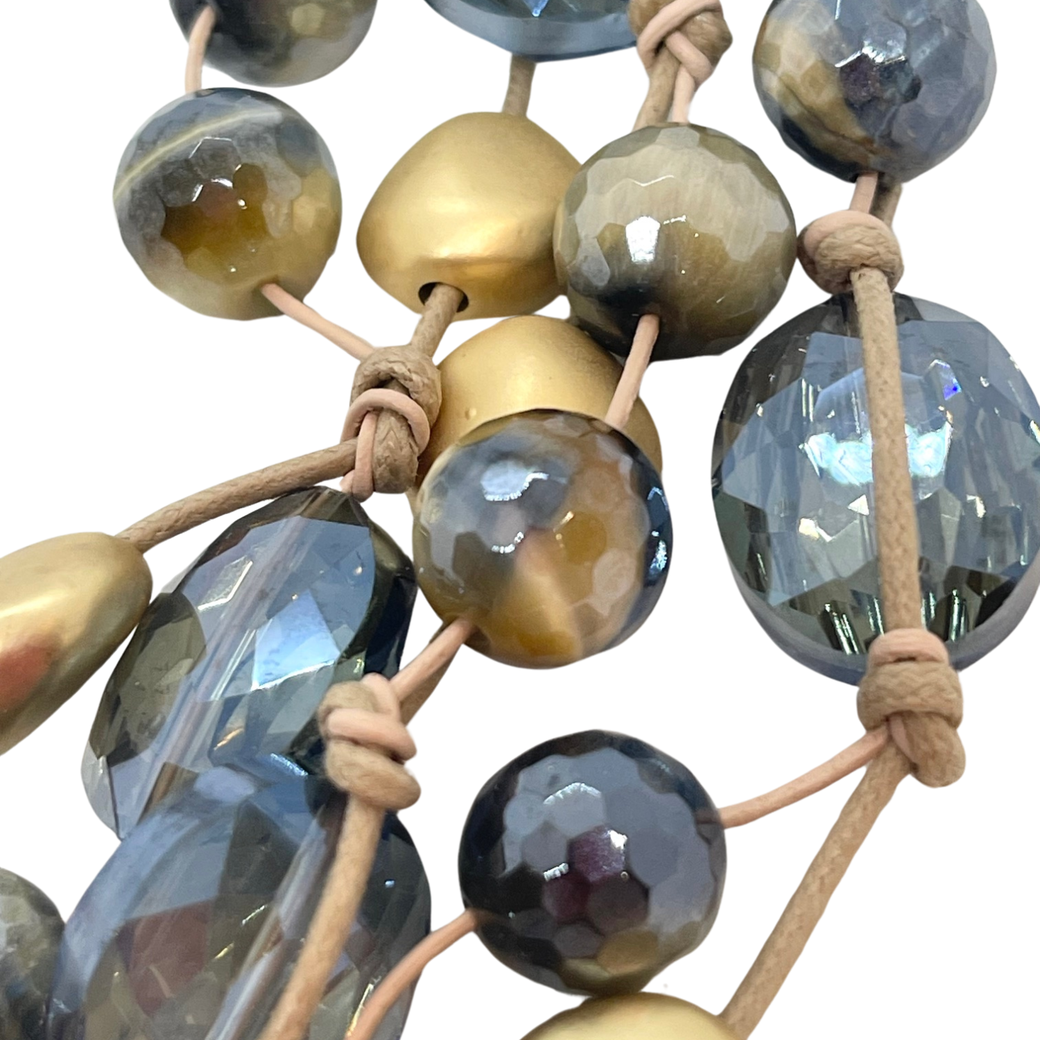 Blue Cream Tigers Eye and Blue Crystal Torsade With Matte Gold Nuggets On Natural Linen And Leather