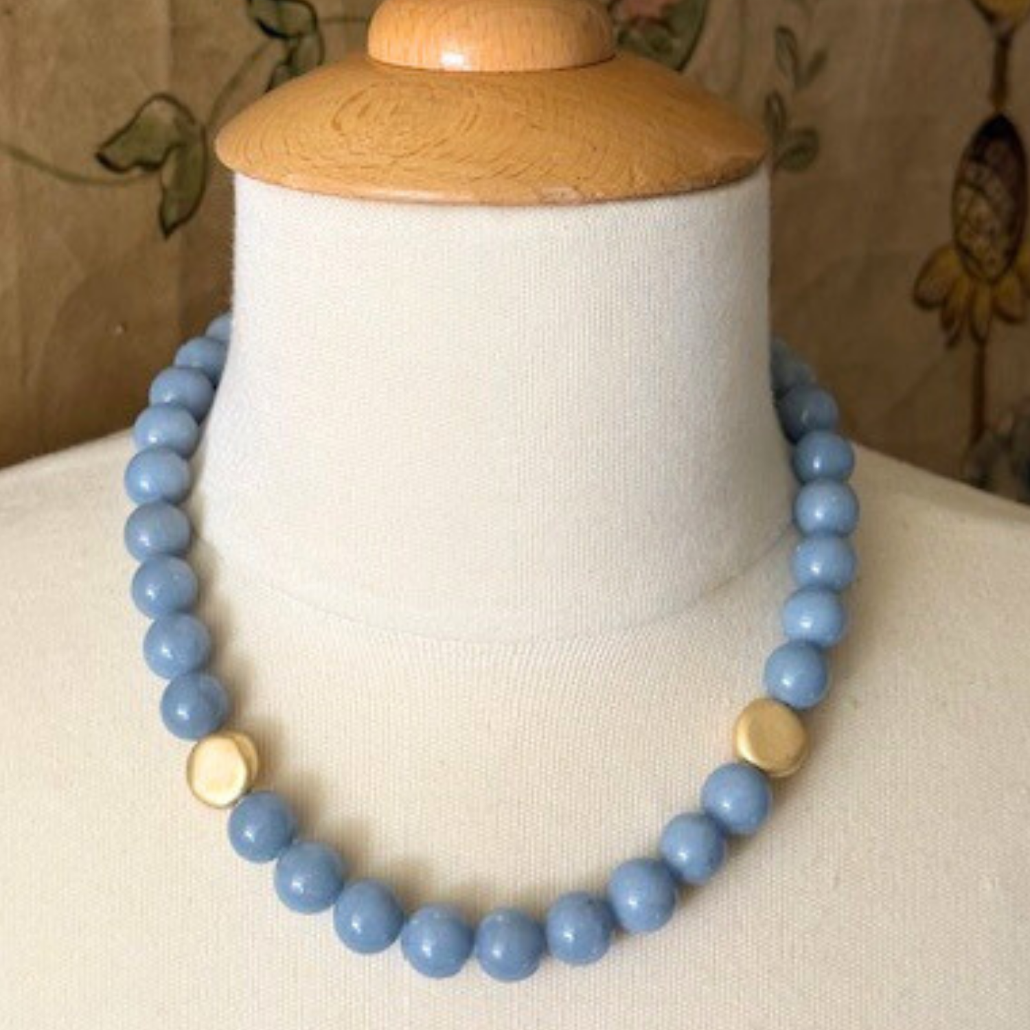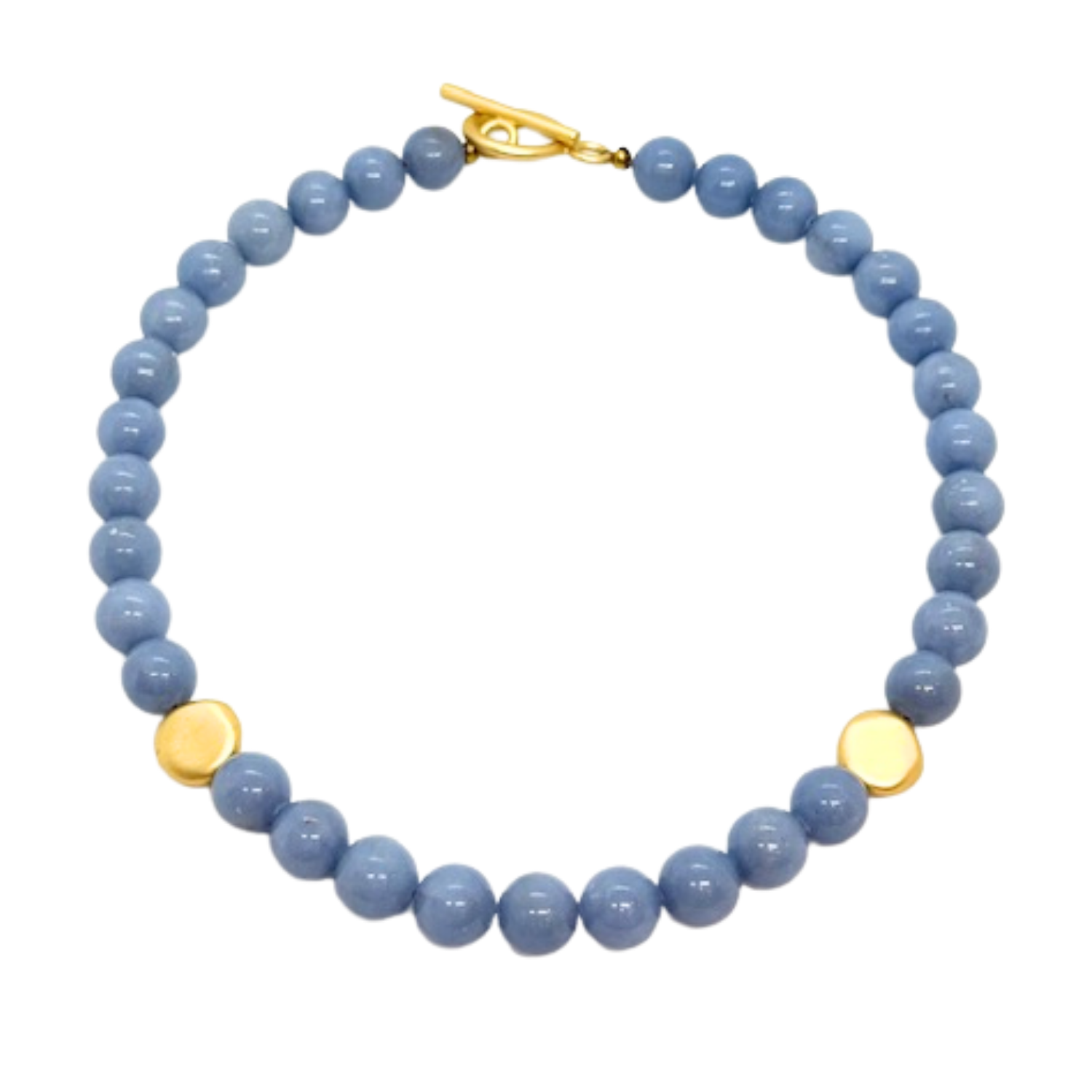 This necklace features striking blue Angelite stones paired with subtle matte gold bead accents.