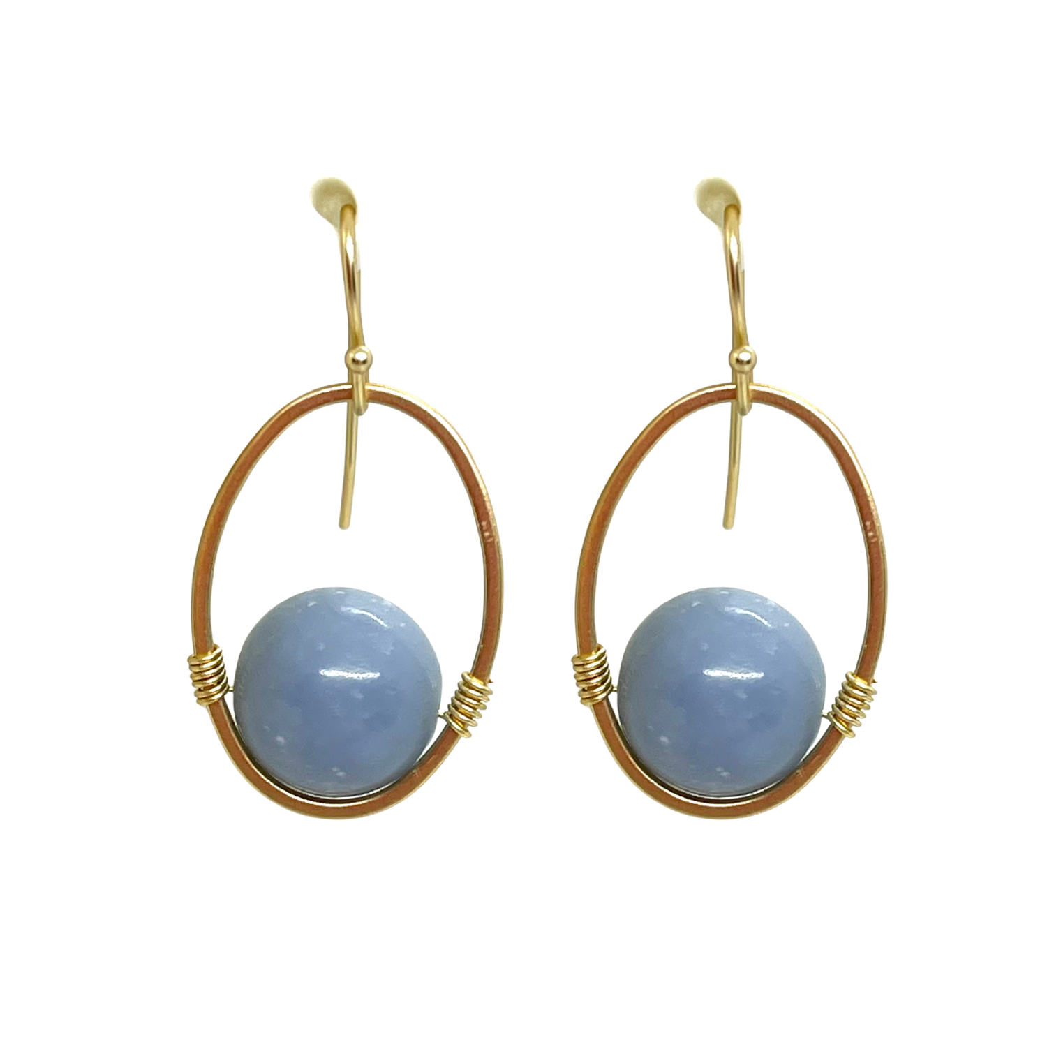 Elegant oval earrings featuring blue angelite stones wire wrapped in a matte gold frame.
