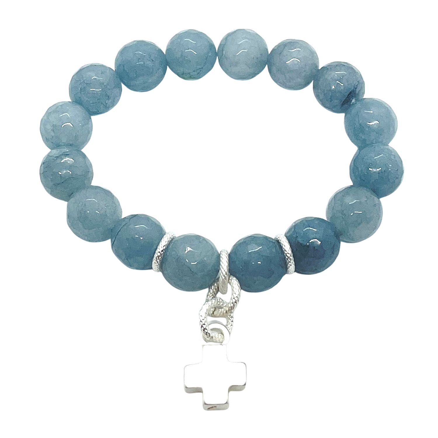 Blue Angelite And Matte Silver Cross Charm Stretch Bracelet
