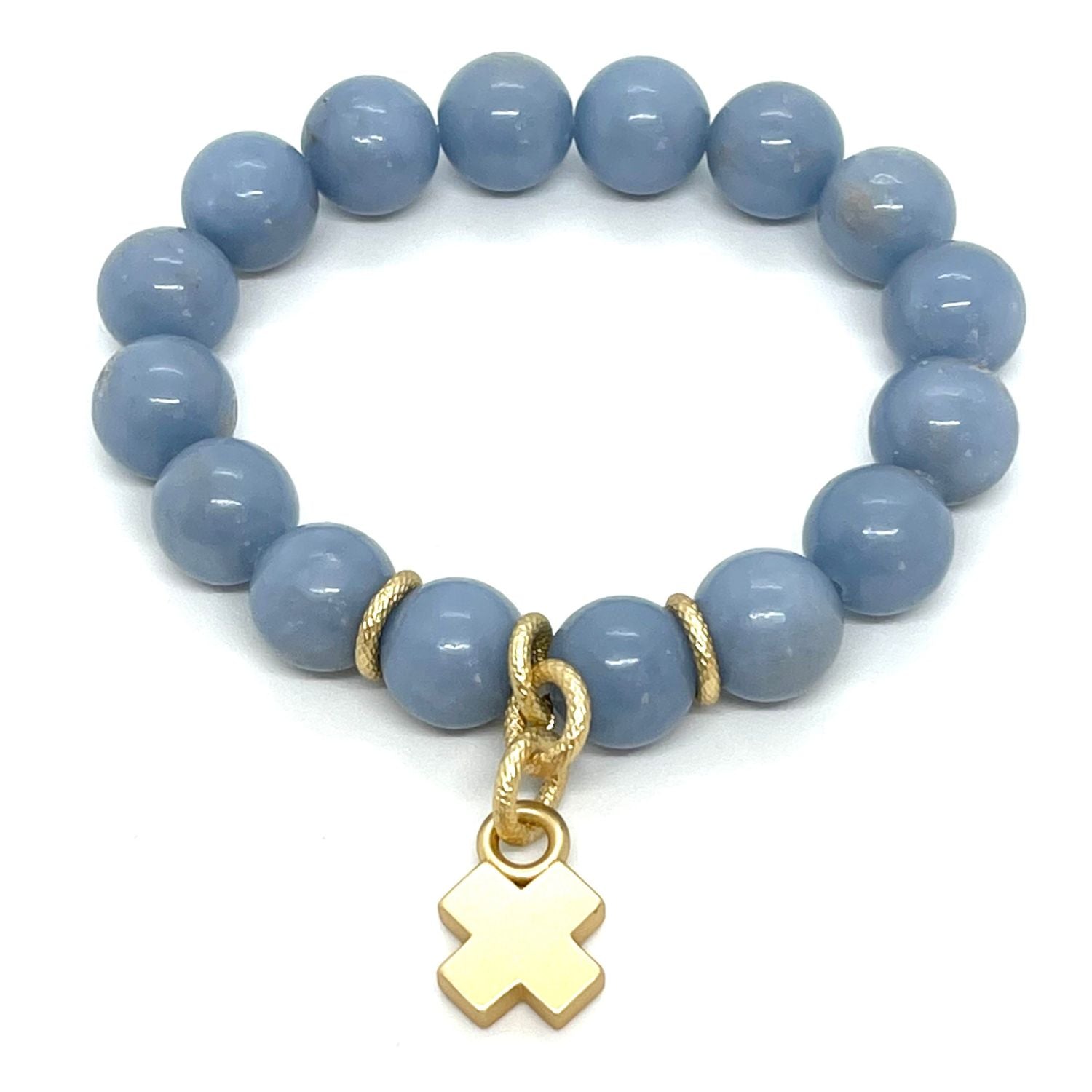 Blue Angelite Matte Gold X Charm Stretch Bracelet