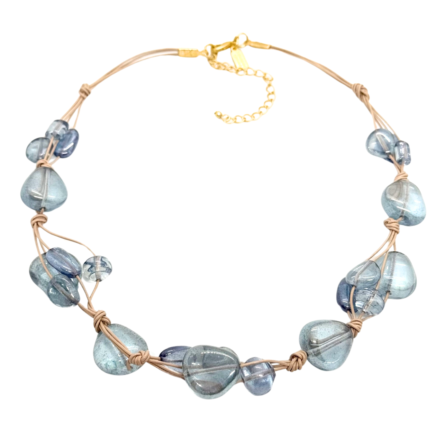 Blue Pressed Glass Woven Necklace on Natural Leather and Linen
