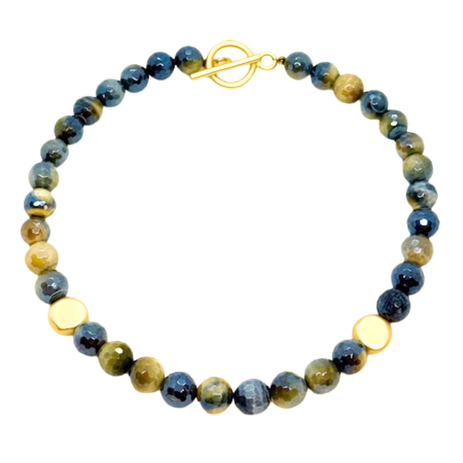 This necklace features striking Blue Cream Tiger's Eye stones paired with subtle matte gold bead accents.