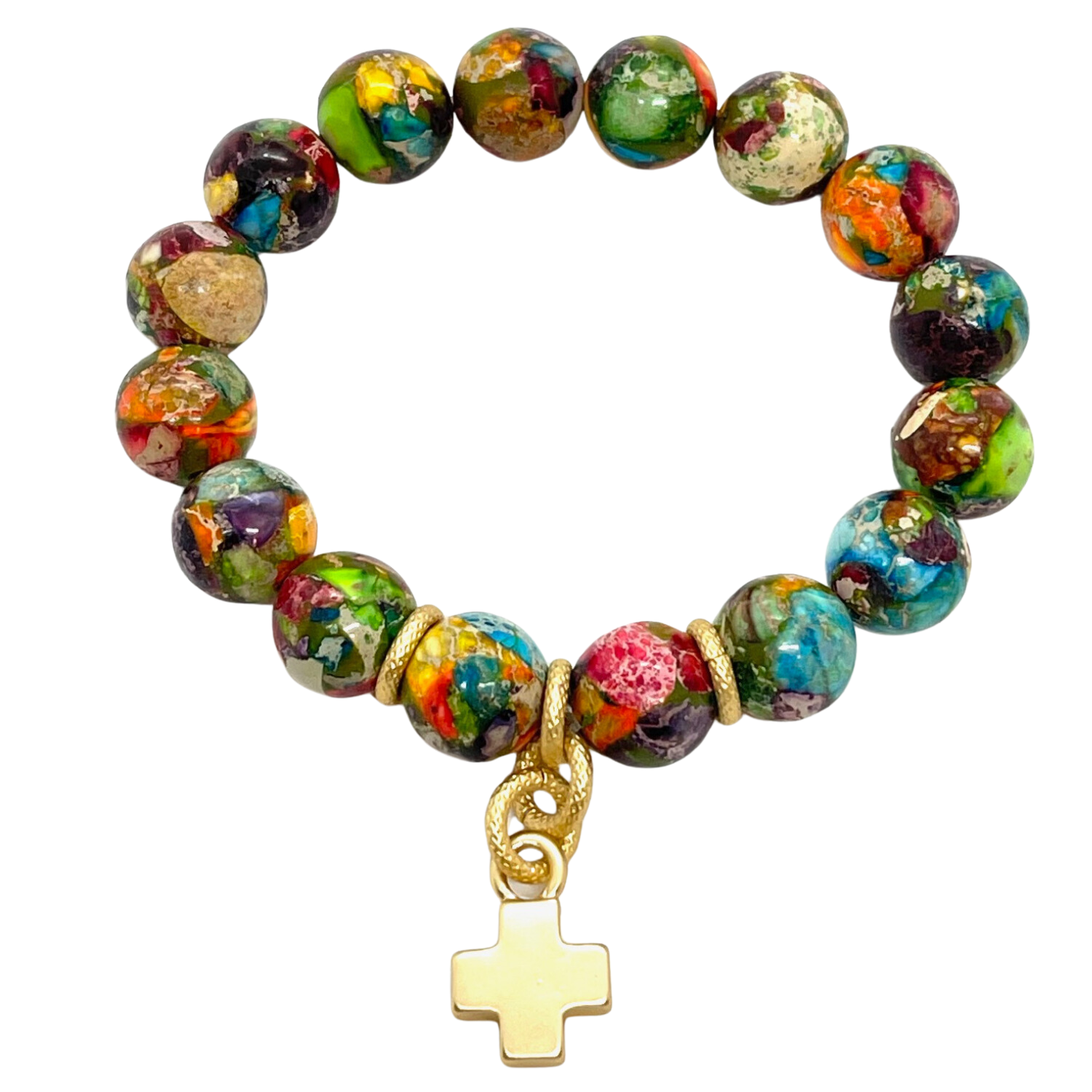 Confetti Jasper Stretch Bracelet With Matte Gold Cross Charm