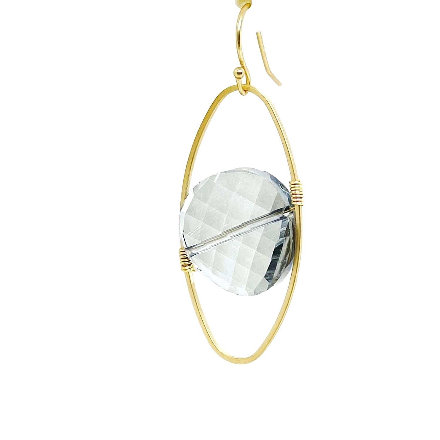 Gray Coin Crystal Matte Gold Oval Gold Wire Wrap Earring