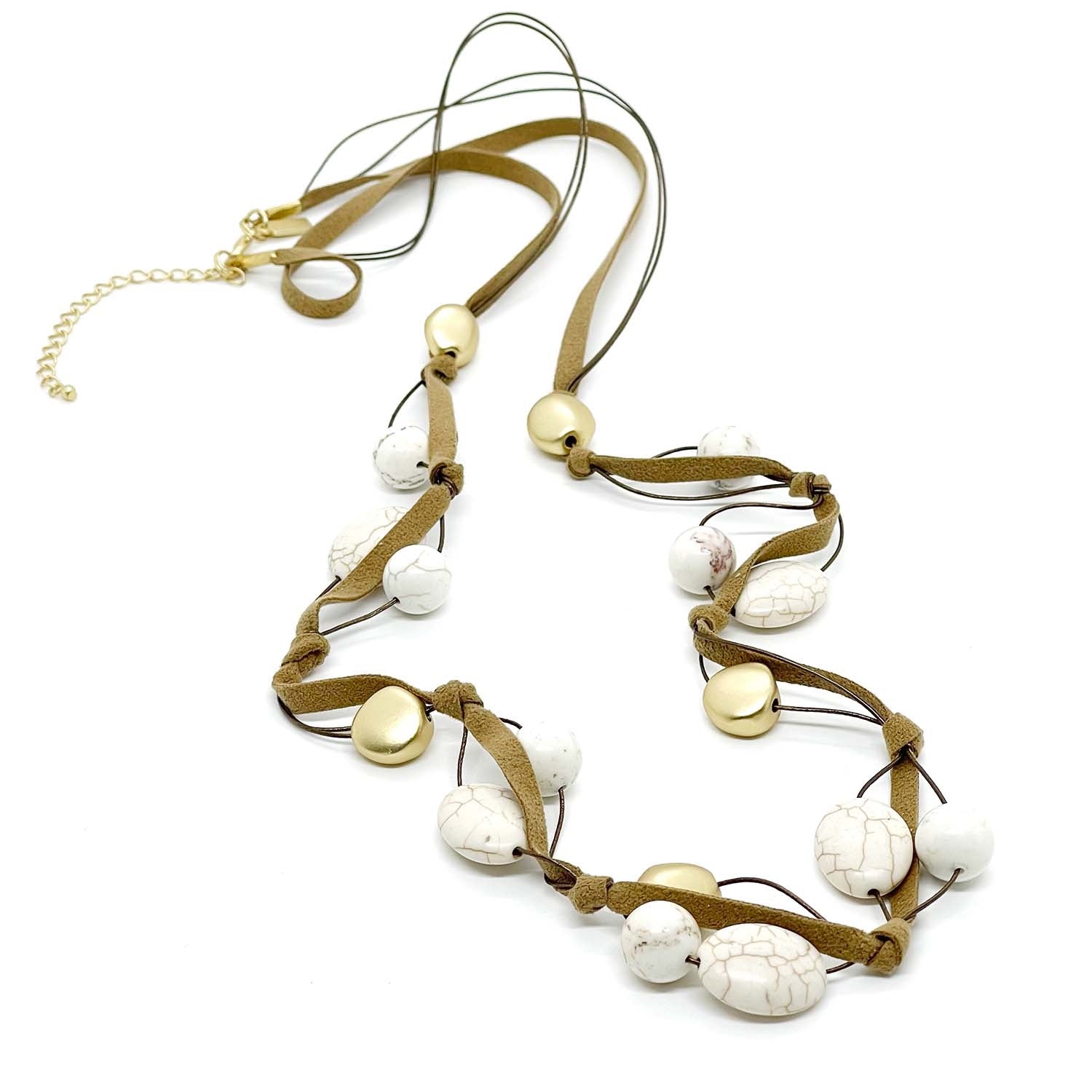 White Magnesite And Matte Gold Pebble Bead 3 Strand Bronze Linen And Leather Torsade Necklace