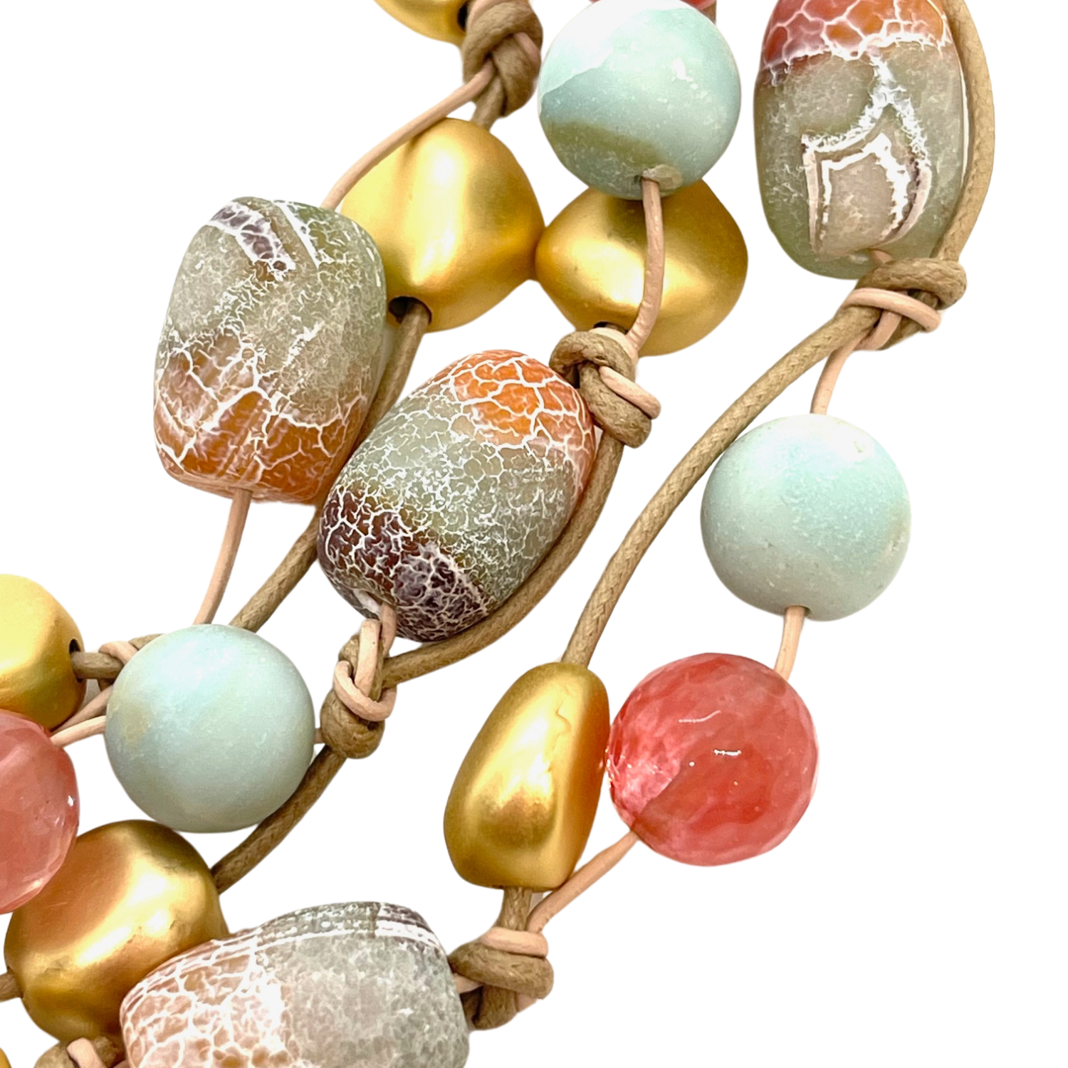 Watermelon Quartz, Fire Agate, and Amazonite Torsade on Natural Linen and Leather
