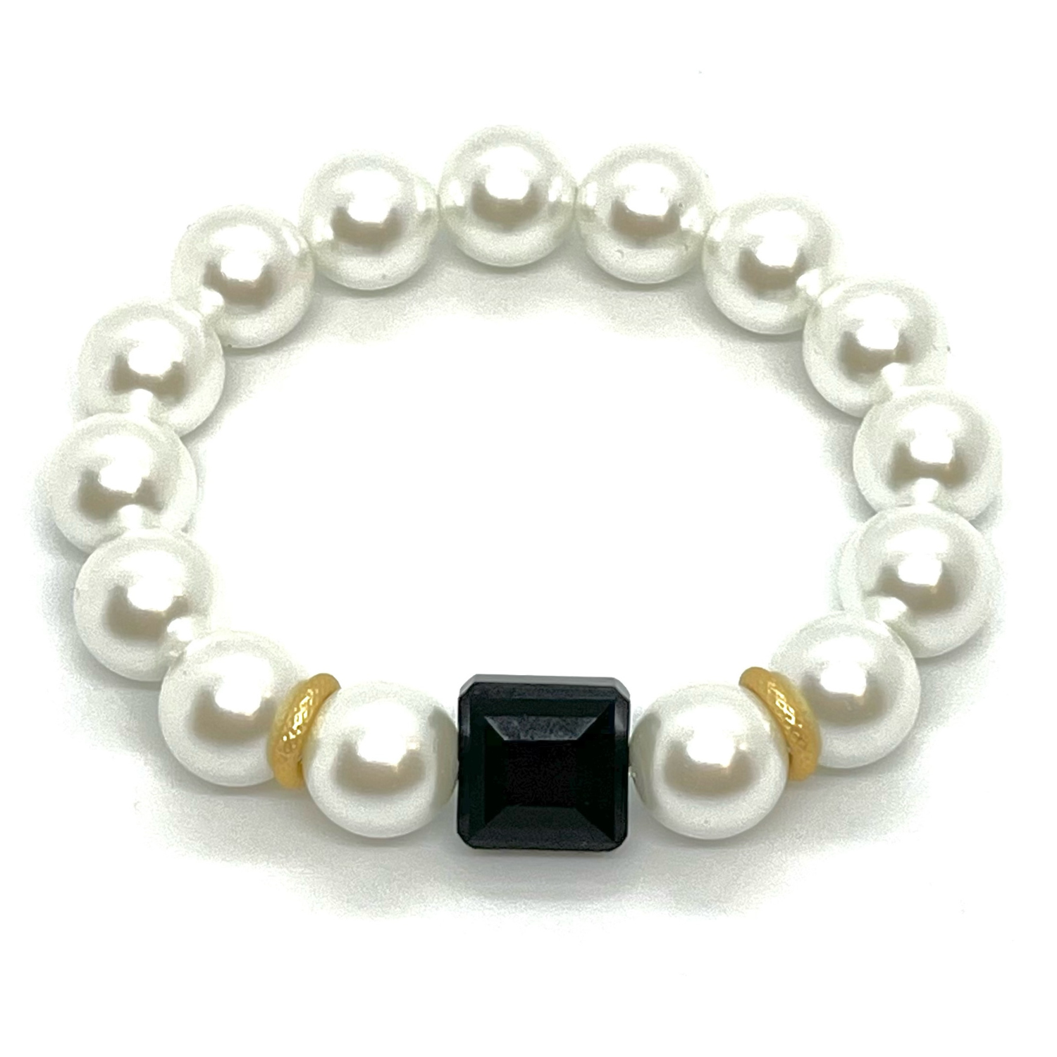 Glass Pearl With Black Square Crystal And Matte Gold Accents Stretch Bracelet