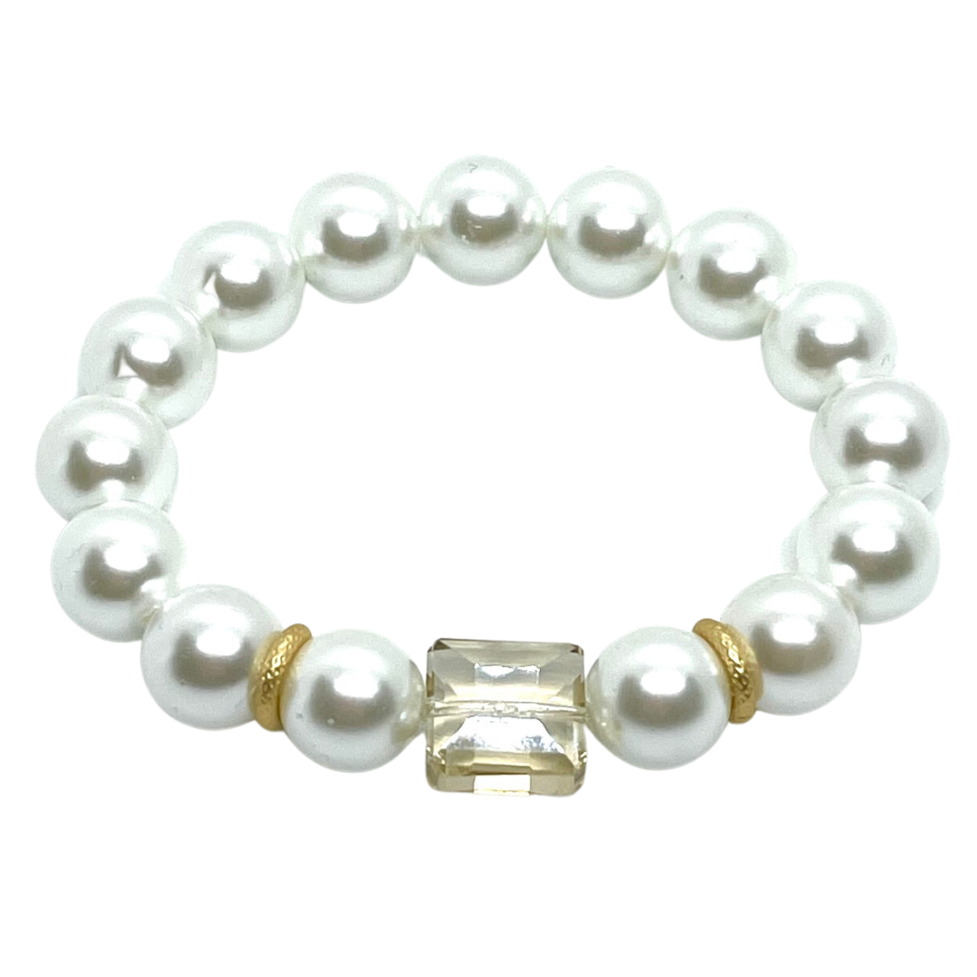 Glass Pearl With Champagne Crystal And Matte Gold Accents Stretch Bracelet