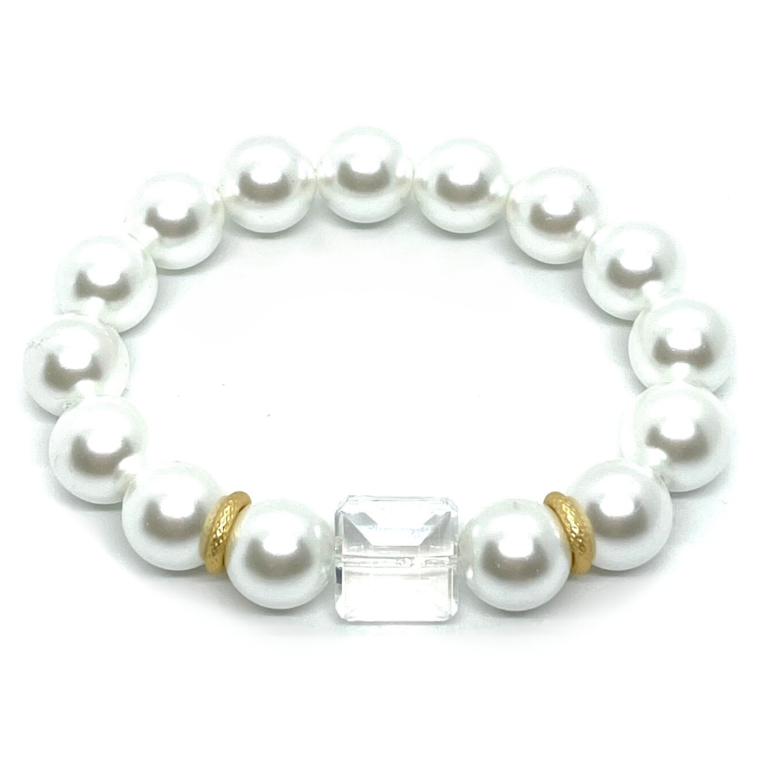 Glass Pearl With Clear Crystal And Matte Gold Accents Stretch Bracelet