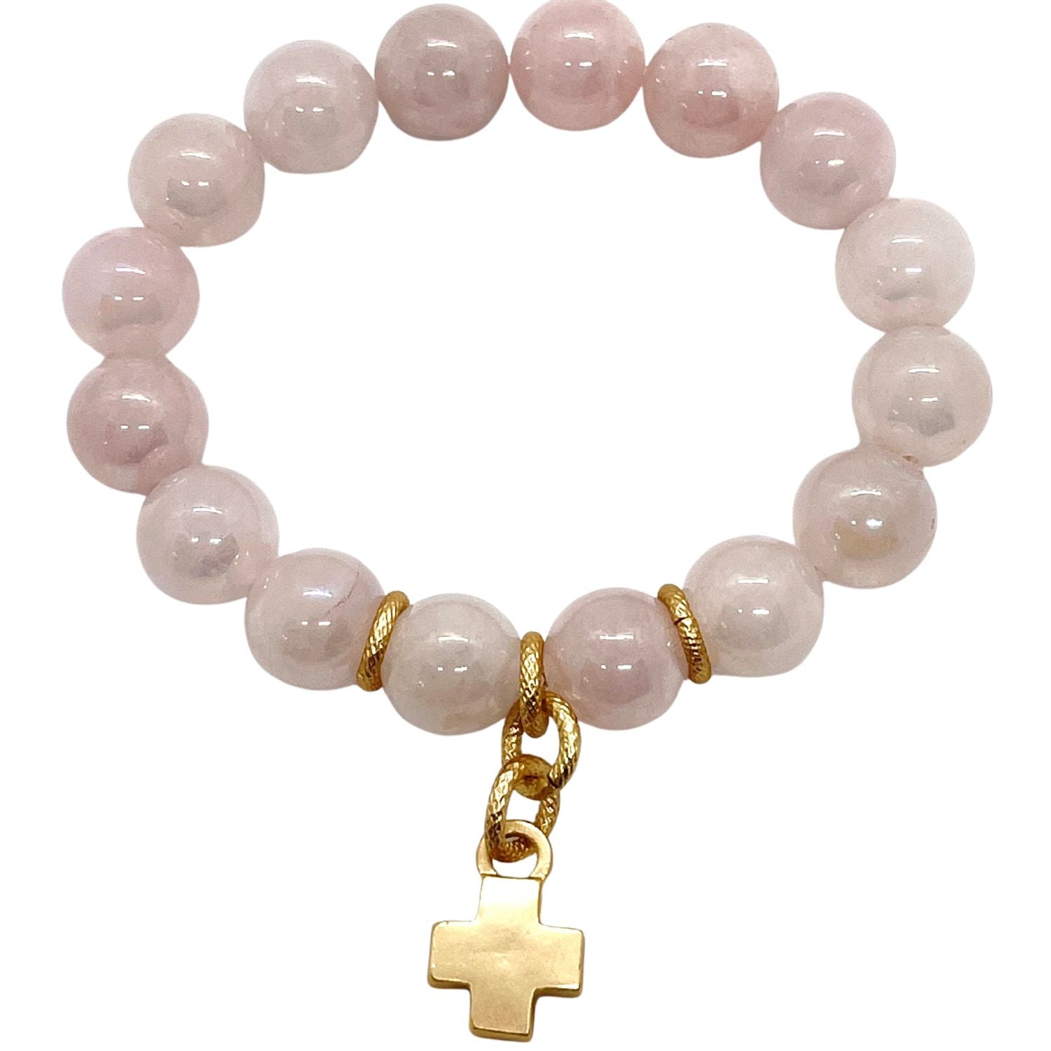 Glazed Rose Quartz Stretch Bracelet With Matte Gold Cross Charm