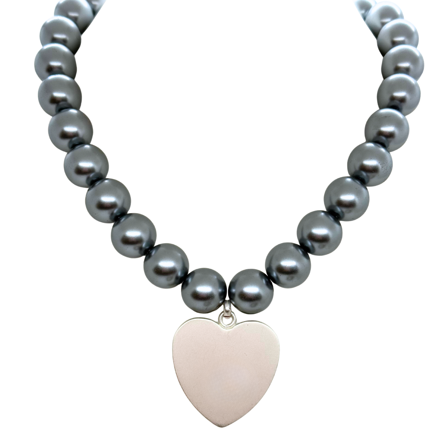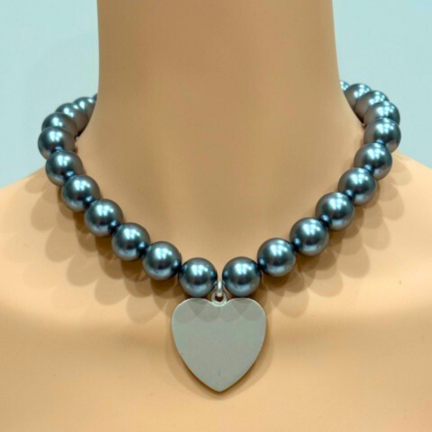 This stunning necklace features large 16mm lustrous gray glass pearls and a distinctive matte silver heart pendant with a matte silver toggle closure.